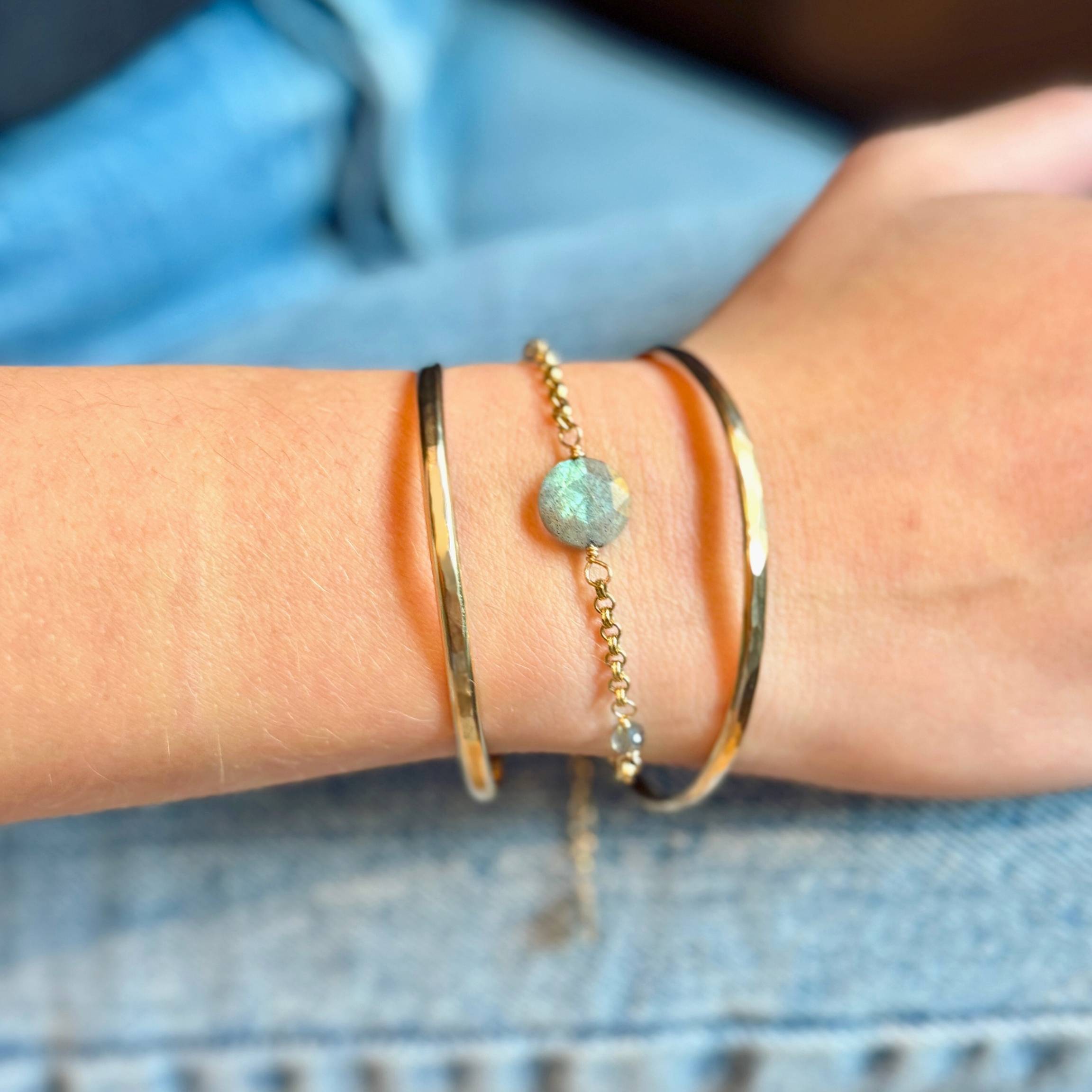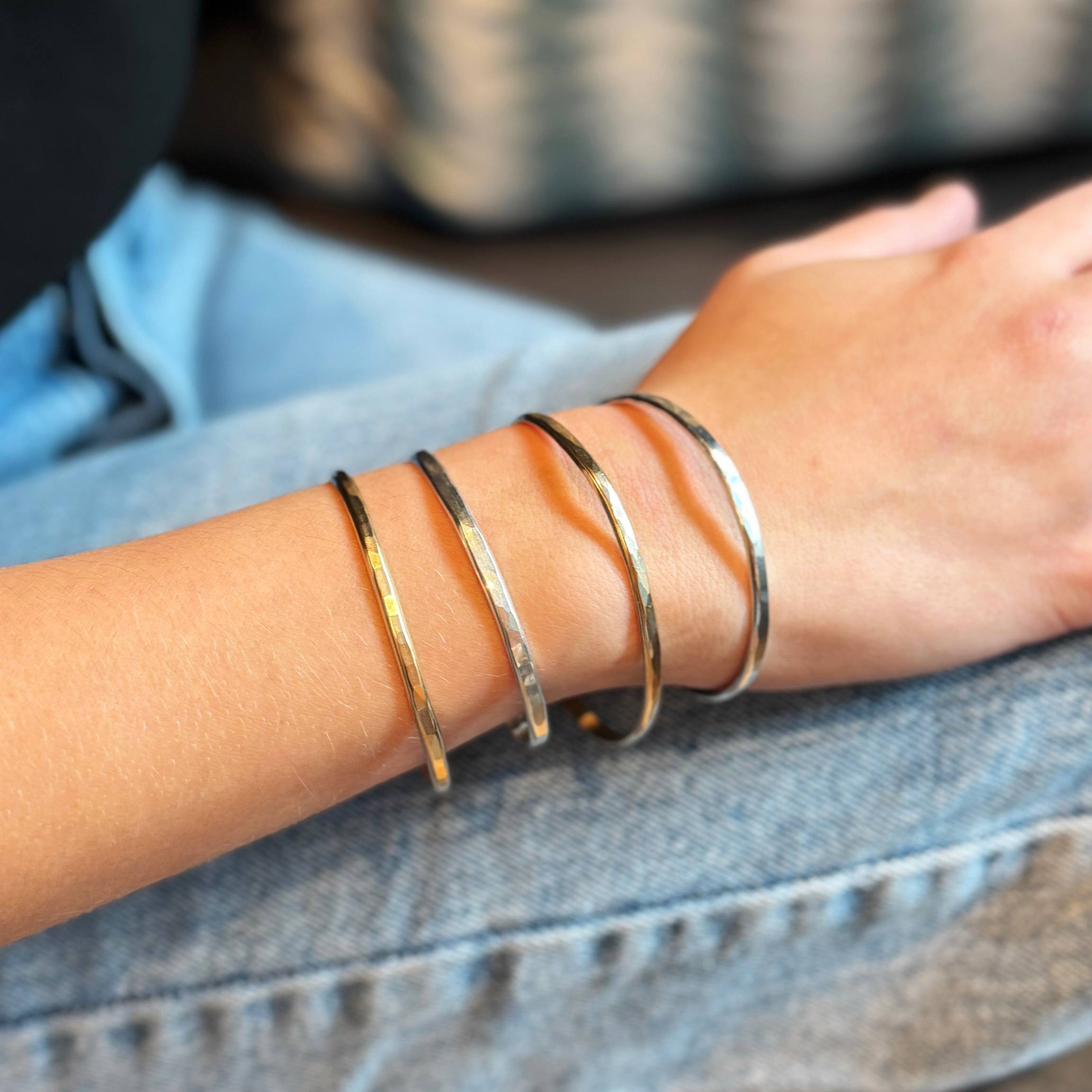 Meet our version of effortless elegance. Our Fallon Cuff is a timeless, hand-forged bangle that adds just the right touch of shine—beautiful worn solo or stacked with your favorite pieces. Each cuff is shaped and hammered by hand in our Nashville studio, giving it a subtly organic texture and one-of-a-kind character. Available in 14k gold-filled or sterling silver, it’s a simple, everyday staple that never goes out of style.