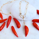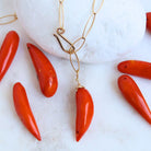 Playful, fiery, and full of personality, our Red Coral Chili Pepper Charm Drop features a  chili-pepper–shaped coral piece It’s the perfect charm for a pop of bold color and a little unexpected fun in your layering mix. Red Coral is traditionally connected with vitality, courage, and energetic uplift.