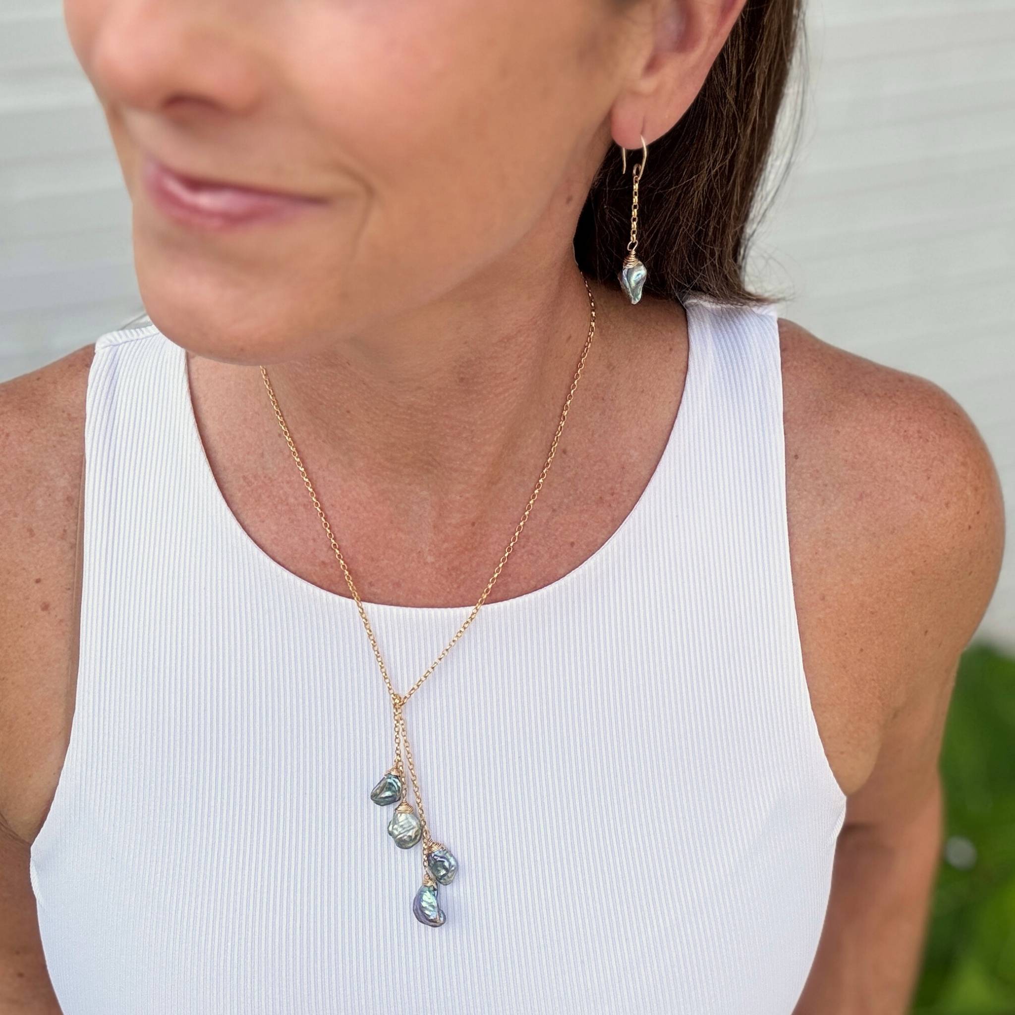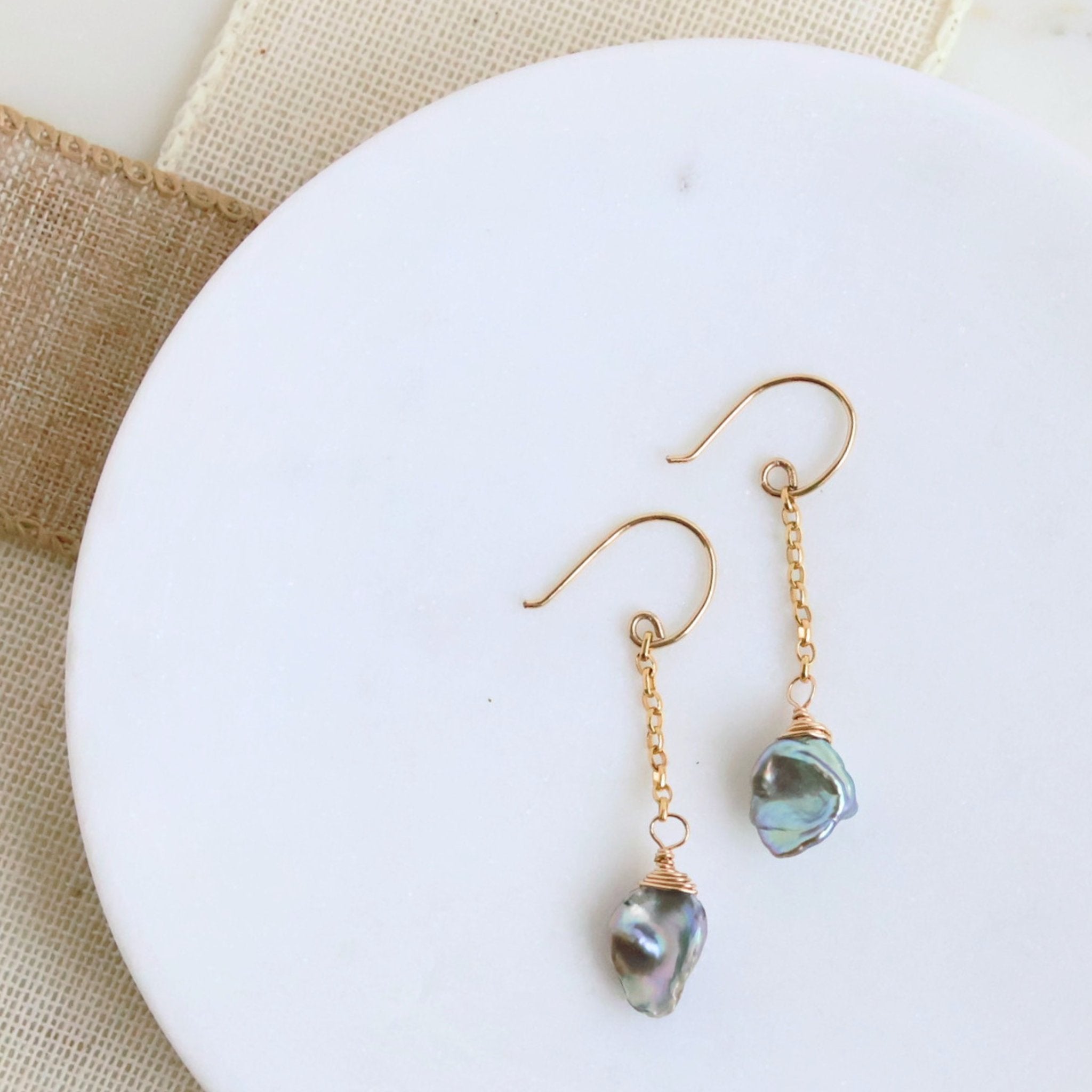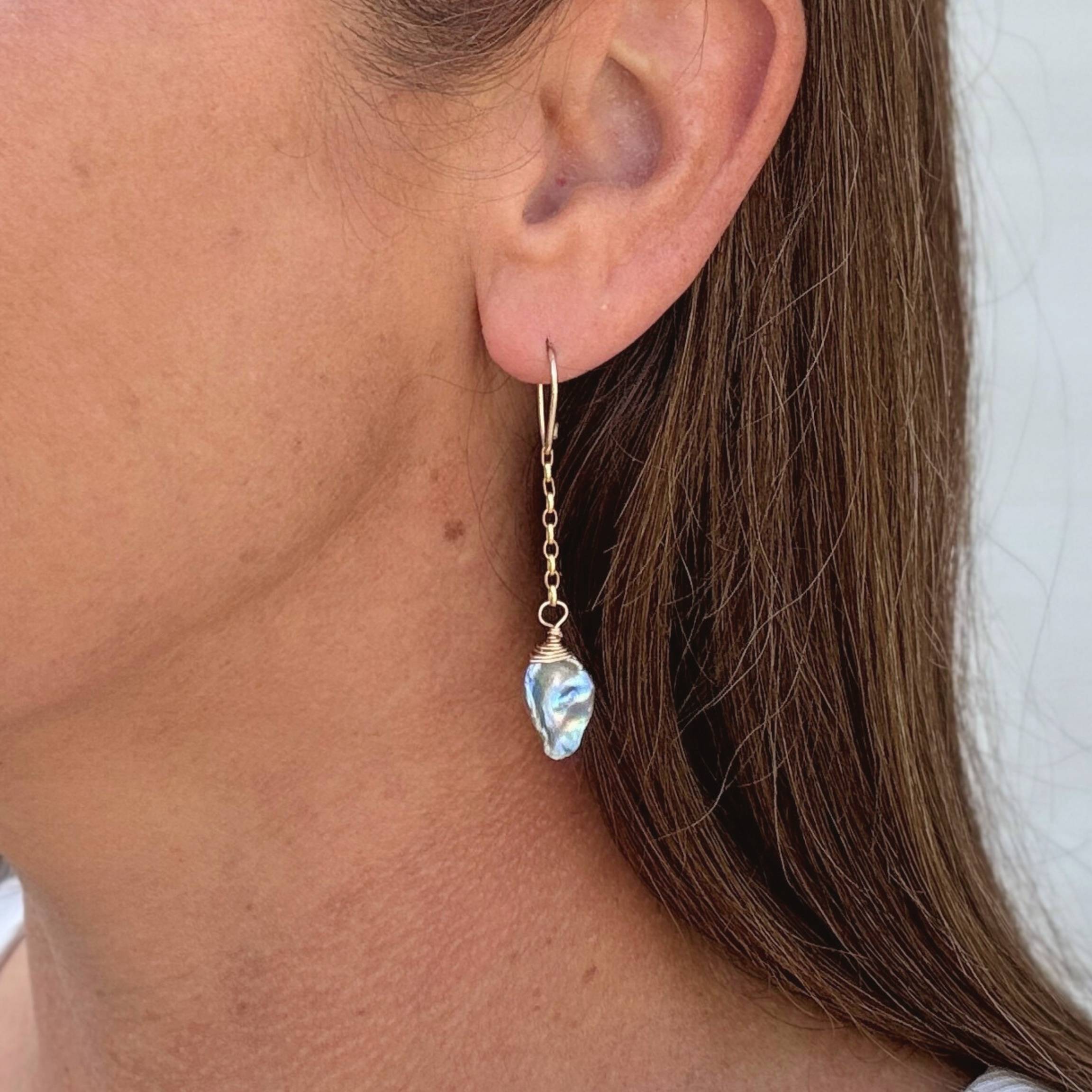 Freshwater Keshi pearls in a delicate, pale peacock blue—each one organically shaped, no two ever the same. Paired and hand wire-wrapped, the pearls bring a natural elegance and uniqueness to the fluid drape of the 14k gold-filled rolo chain and handmade ear wires.