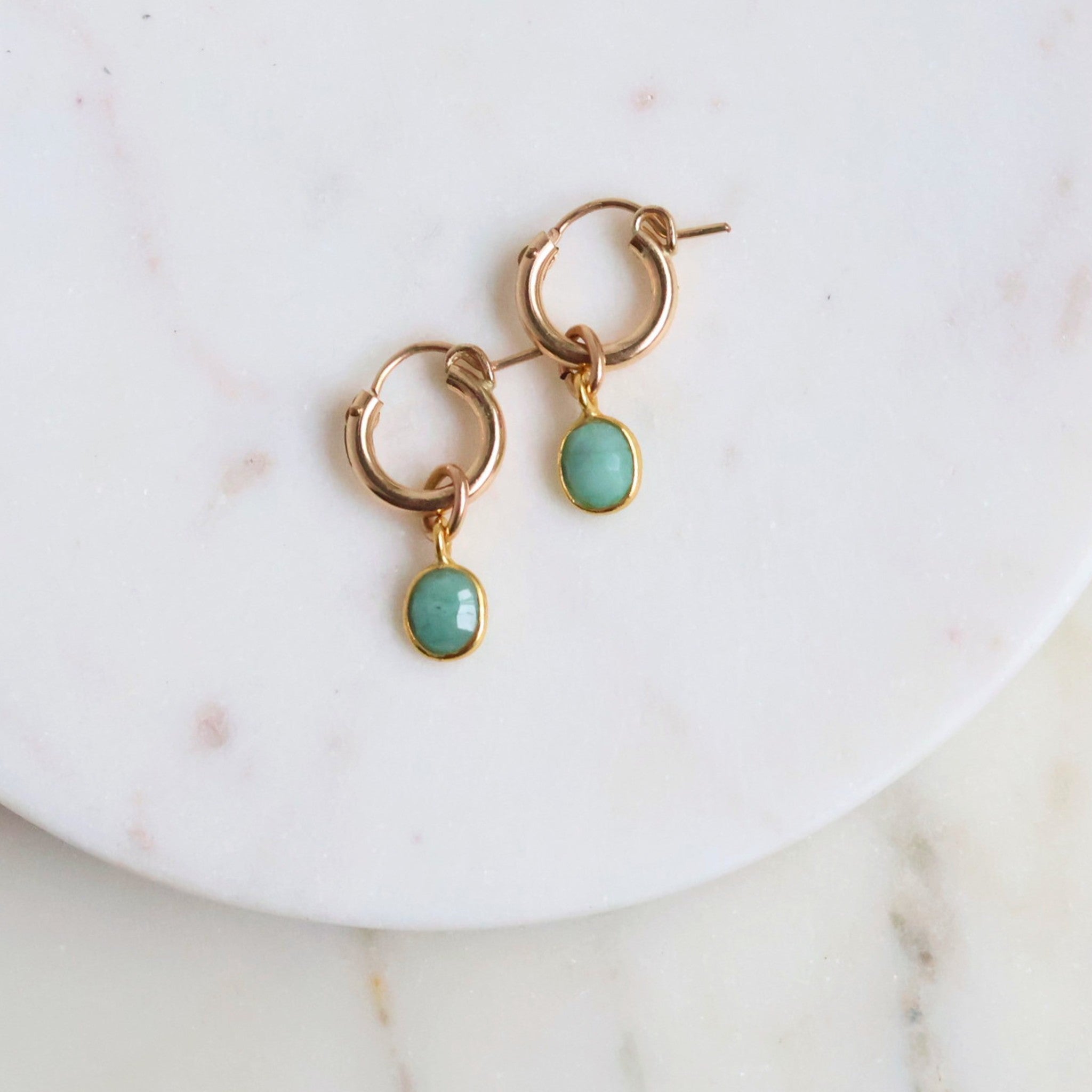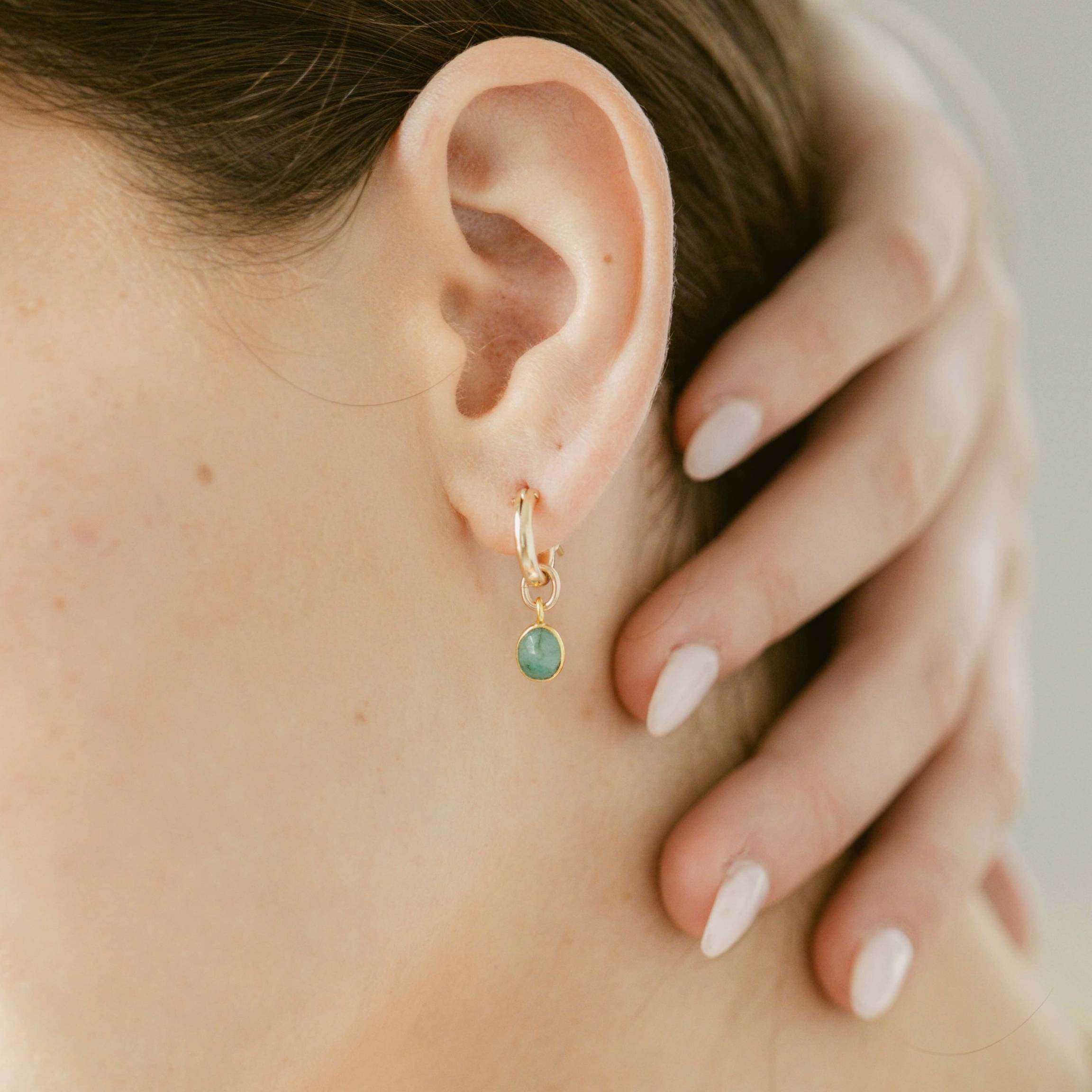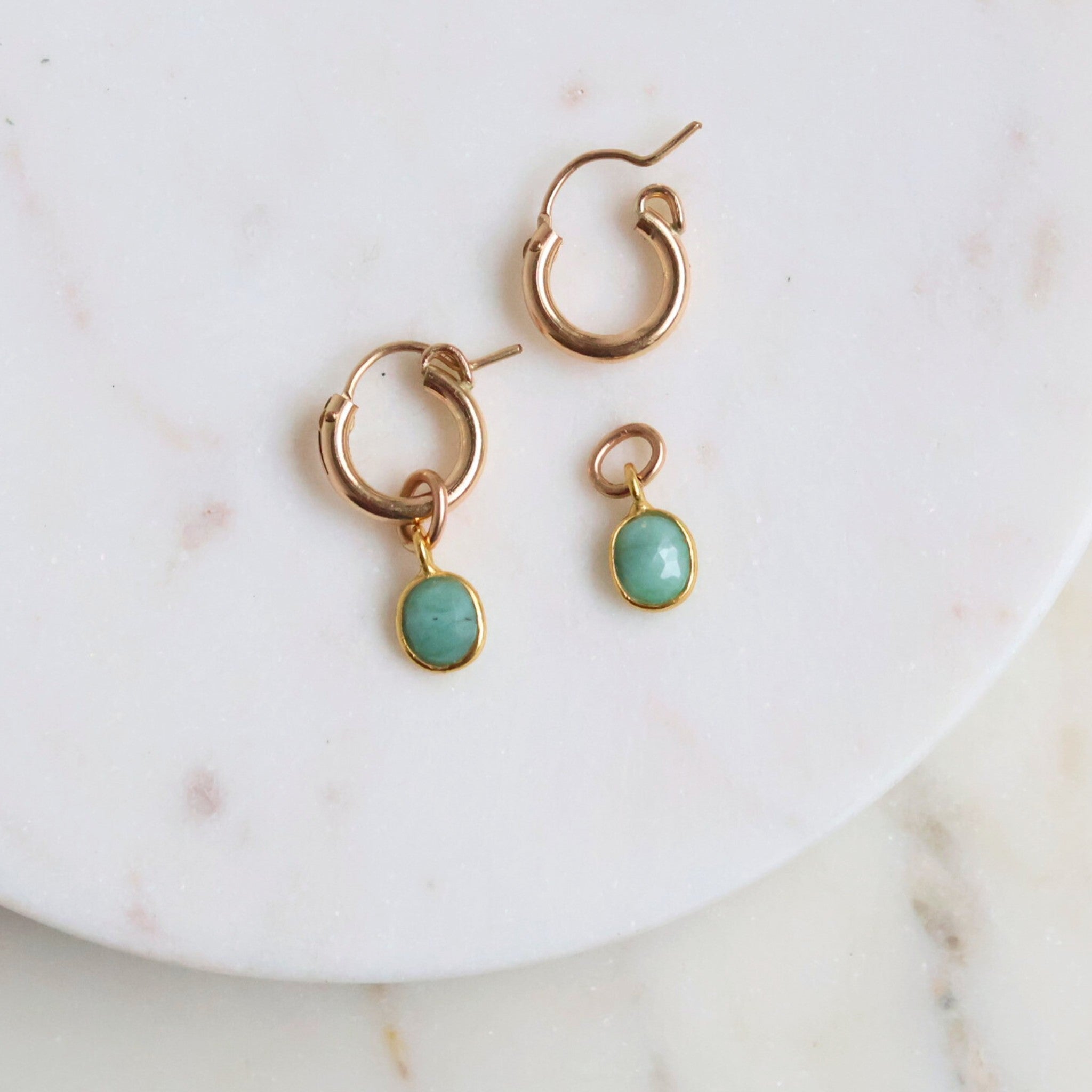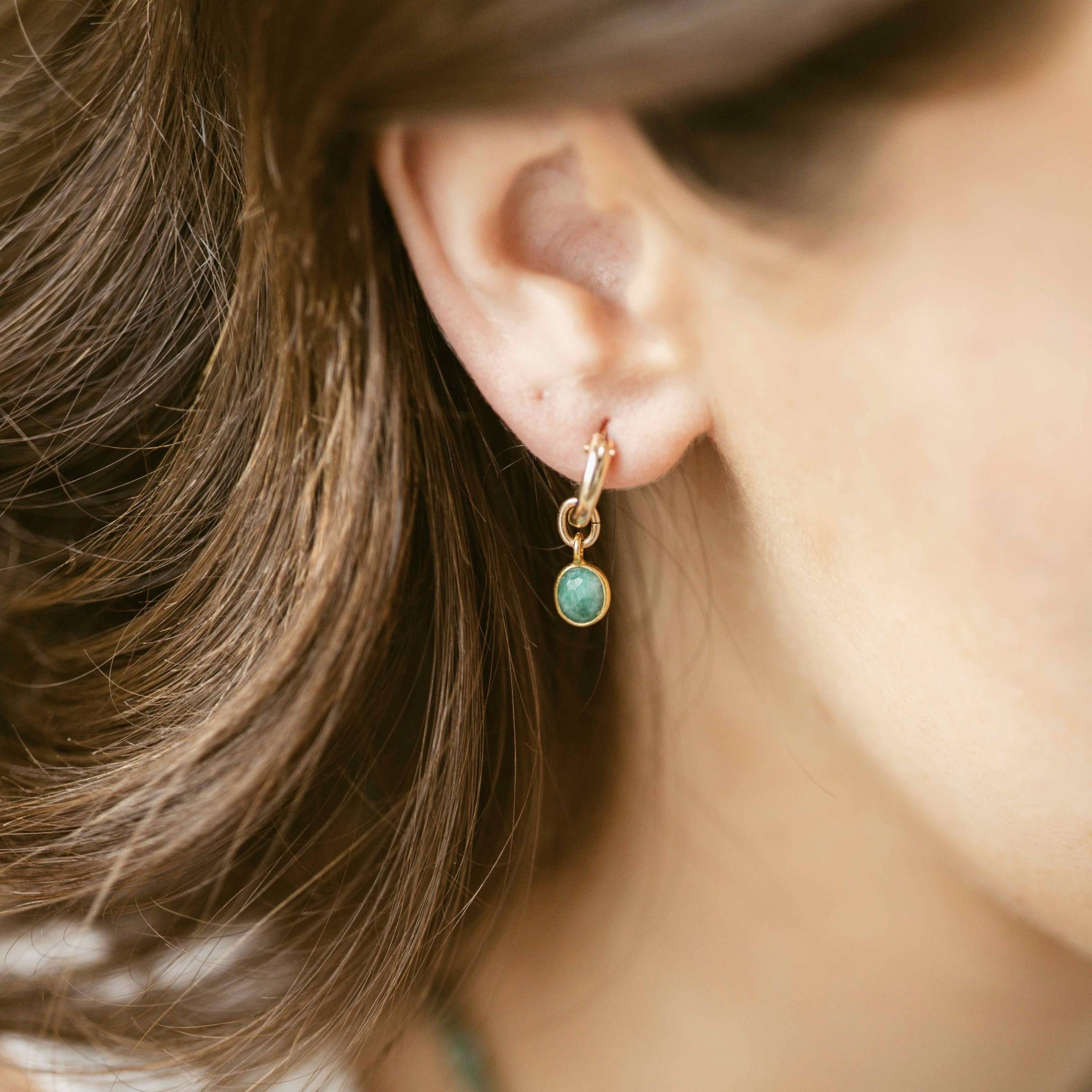 Playful, polished, and incredibly versatile. Our Emerald Charm Drop earrings feature rose-cut green Emeralds set in rich vermeil gold, hanging delicately from 14KT gold-filled huggie hoops. The gemstone charms are removable, making it easy to switch up your look—wear the Emeralds for a pop of color, or keep it simple with the gold hoops on their own. Part of our Charm Drop Earring collection, these earrings are designed to mix, match, and move with you. Also available in Sapphire, Labradorite, Moonstone, and Ruby.