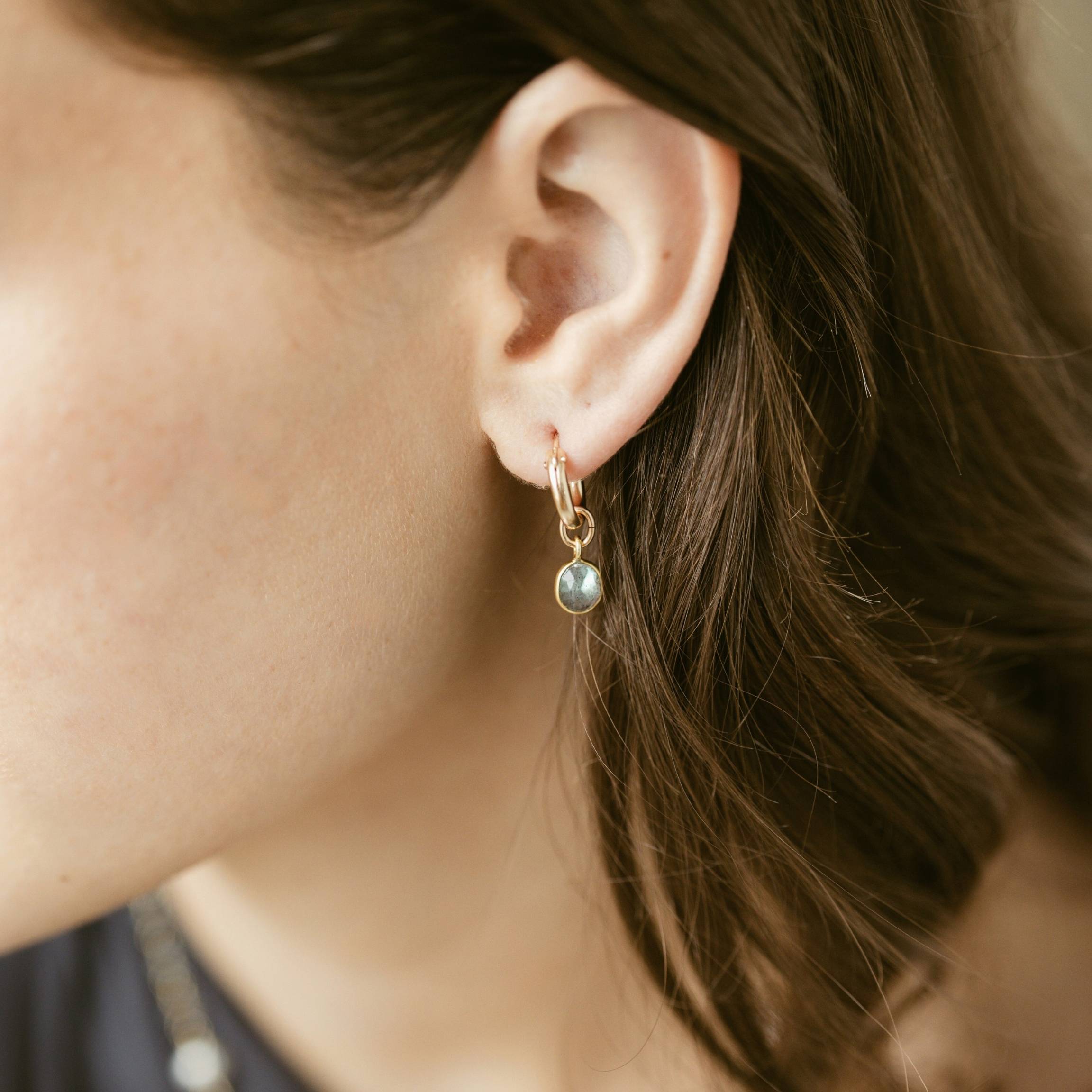 Playful, polished, and incredibly versatile. Our Labradorite Charm Drop earrings feature rose-cut Labradorite set in rich vermeil gold, hanging delicately from 14k gold-filled huggie hoops. The gemstone charms are removable, making it easy to switch up your look—wear the Labradorite to add a subtle touch of flash, or keep it simple with the gold hoops on their own. Part of our Charm Drop Earring collection, these earrings are designed to mix, match, and move with you. Also available in Sapphire, Moonstone, Emerald, and Ruby.