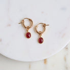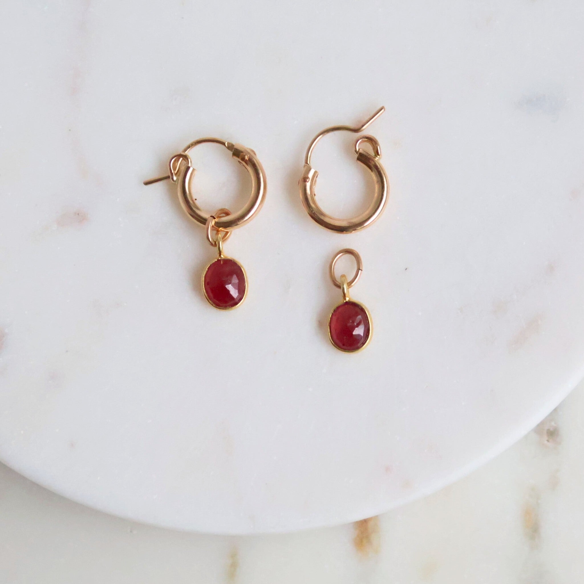 Playful, polished, and incredibly versatile. Our Ruby Charm Drop earrings feature rose-cut  Rubies set in rich vermeil gold, hanging delicately from 14k gold-filled huggie hoops. The gemstone charms are removable, making it easy to switch up your look—wear the Rubies for a subtle pop of color, or keep it simple with the gold hoops on their own. Part of our Charm Drop Earring collection, these earrings are designed to mix, match, and move with you. Also available in Sapphire, Labradorite, Moonstone, and Emerald.