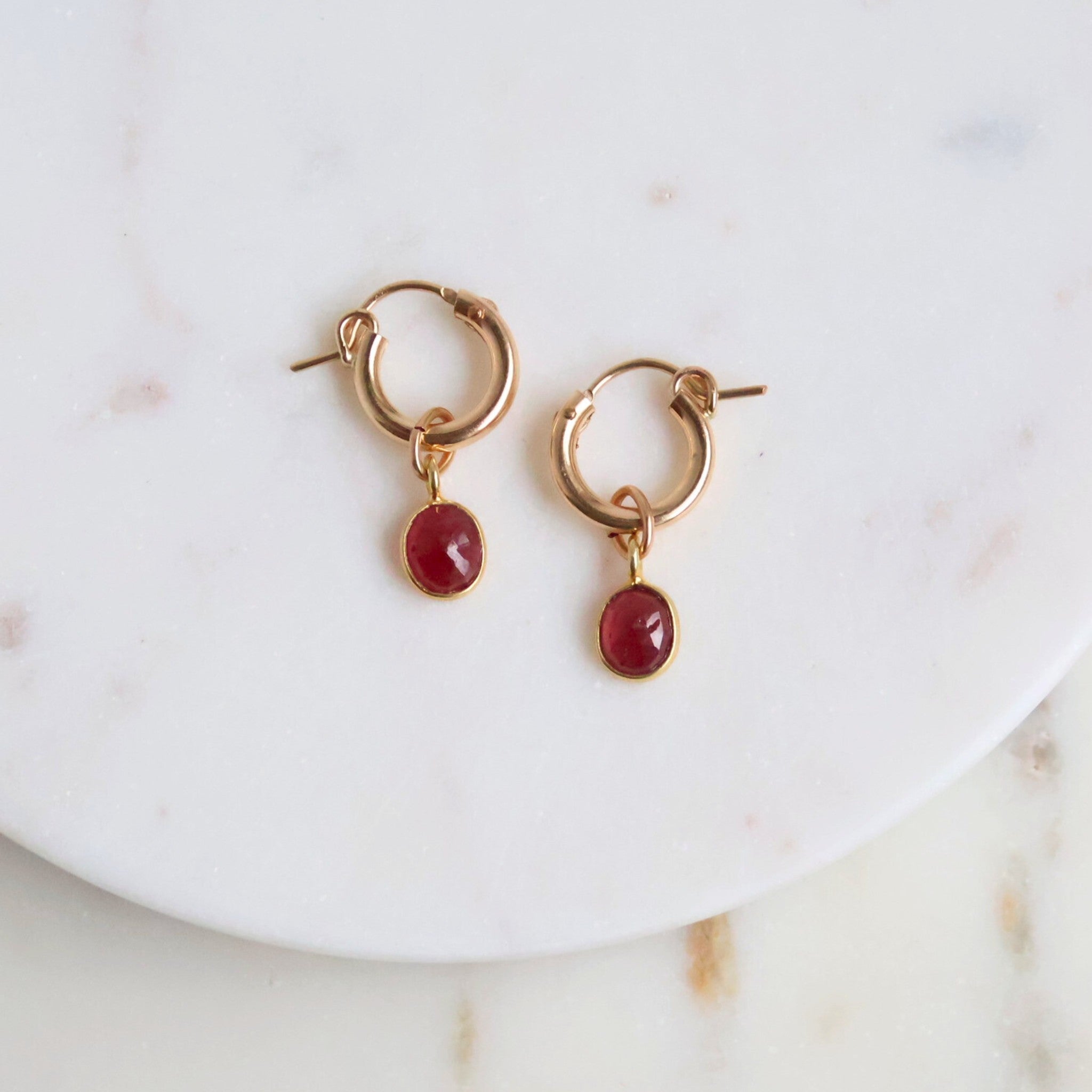 • Materials: 14k gold filled hoop earrings, removable Vermeil gold bezel with rose cut Rubies
