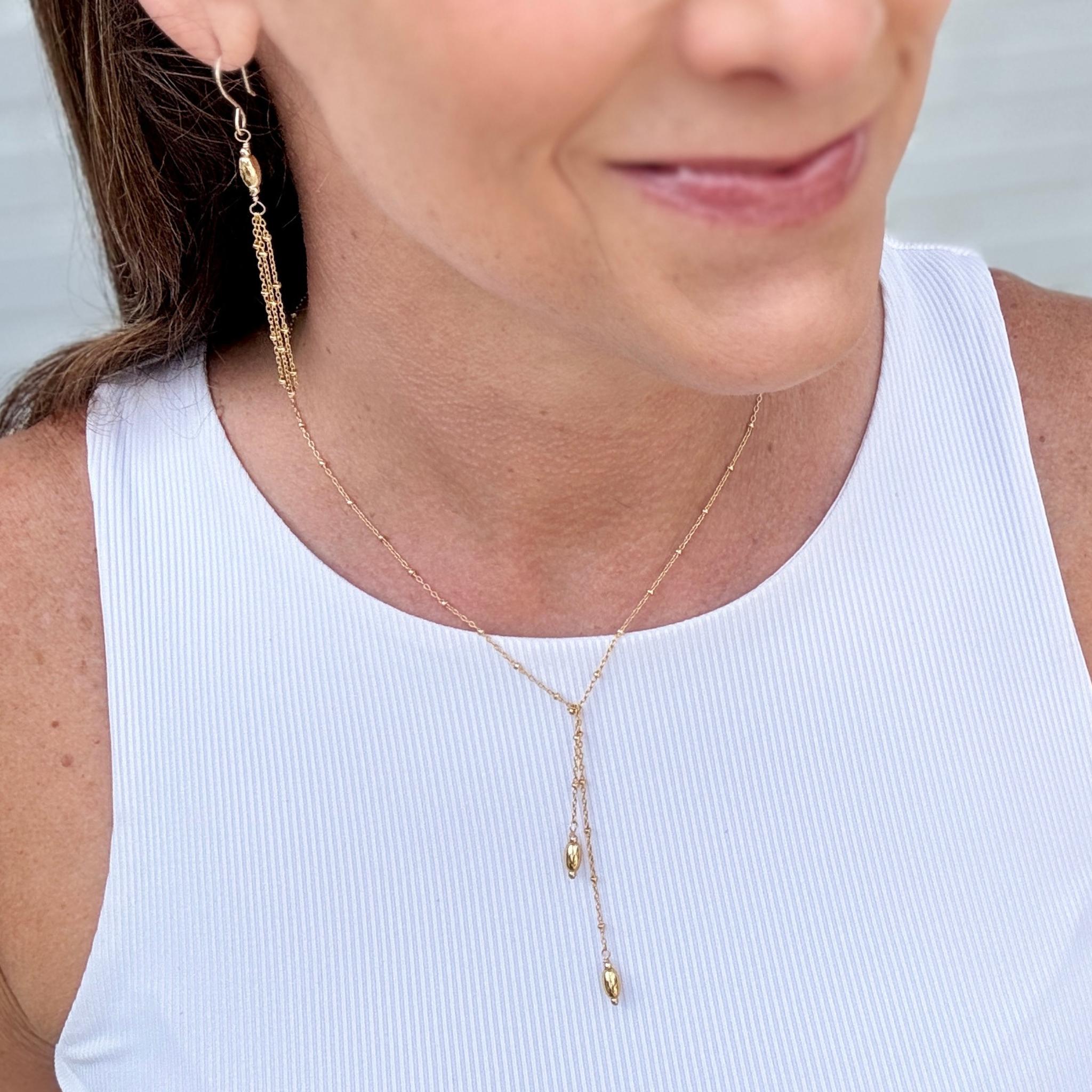 Long, lean, and effortlessly luminous. Our Sadie Duster Earrings bring understated drama to any look with three tiers of 14KT gold-filled satellite chain, joined by a polished gold barrel bead. Their graceful movement and subtle shimmer make them an easy go-to—from everyday elegance to an evening out. Designed to pair perfectly with our Sadie Lariat for a cohesive, modern look.
