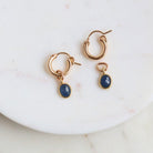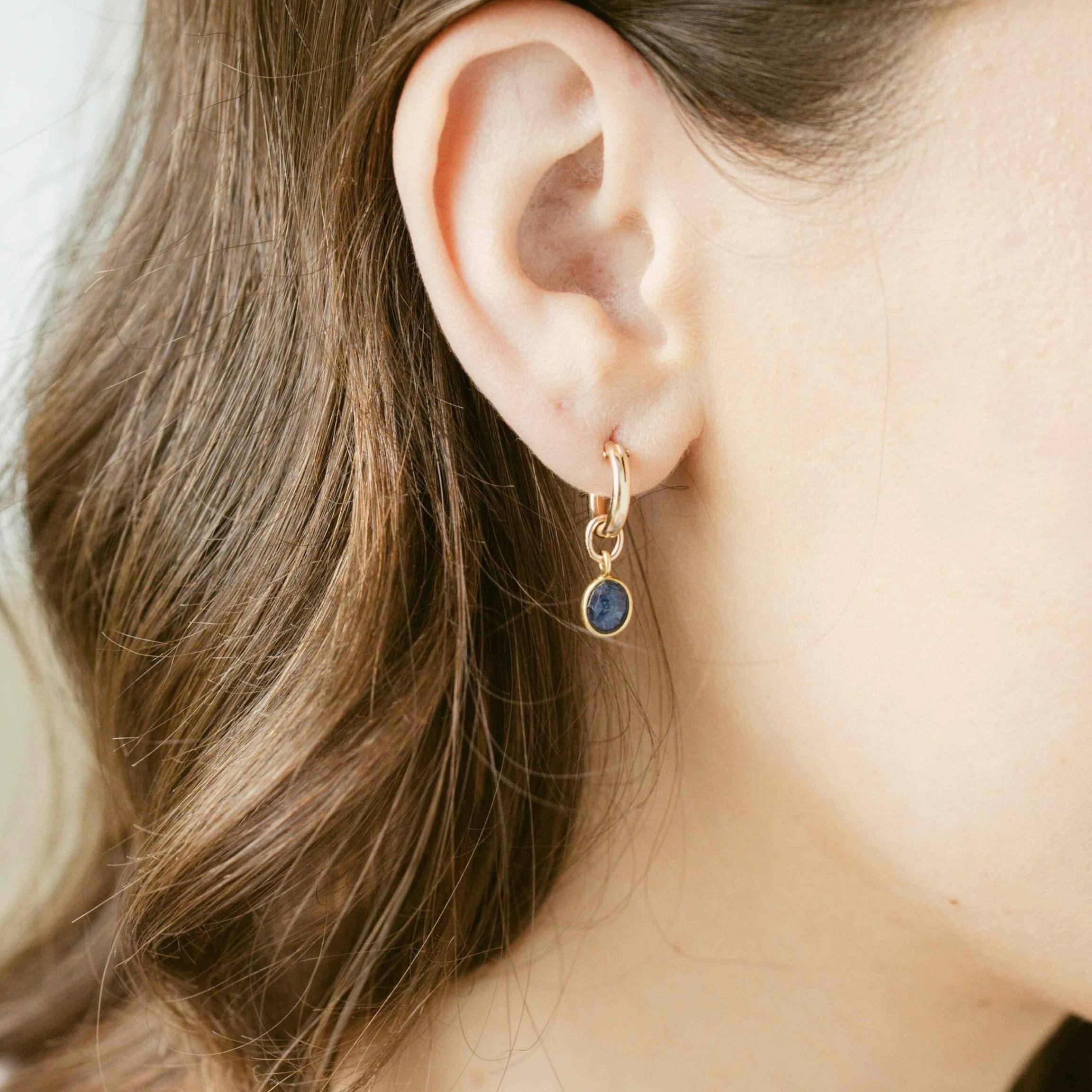 Playful, polished, and incredibly versatile. Our Sapphire Charm Drop earrings feature rose-cut blue Sapphires set in rich vermeil gold, hanging delicately from 14k gold-filled huggie hoops. The charms are removable, making it easy to switch up your look—wear the sapphires for a touch of elegance, or keep it simple with the gold hoops on their own. Part of our Charm Drop collection, these earrings are designed to mix, match, and move with you. Also available in Emerald, Labradorite, Moonstone, and Ruby.