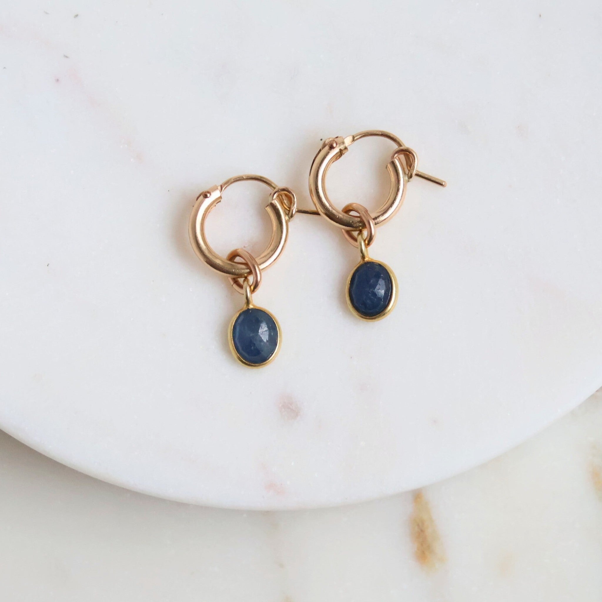 - Materials: 14k gold filled huggie hoop earrings, removable Vermeil gold bezel with rose cut Sapphires