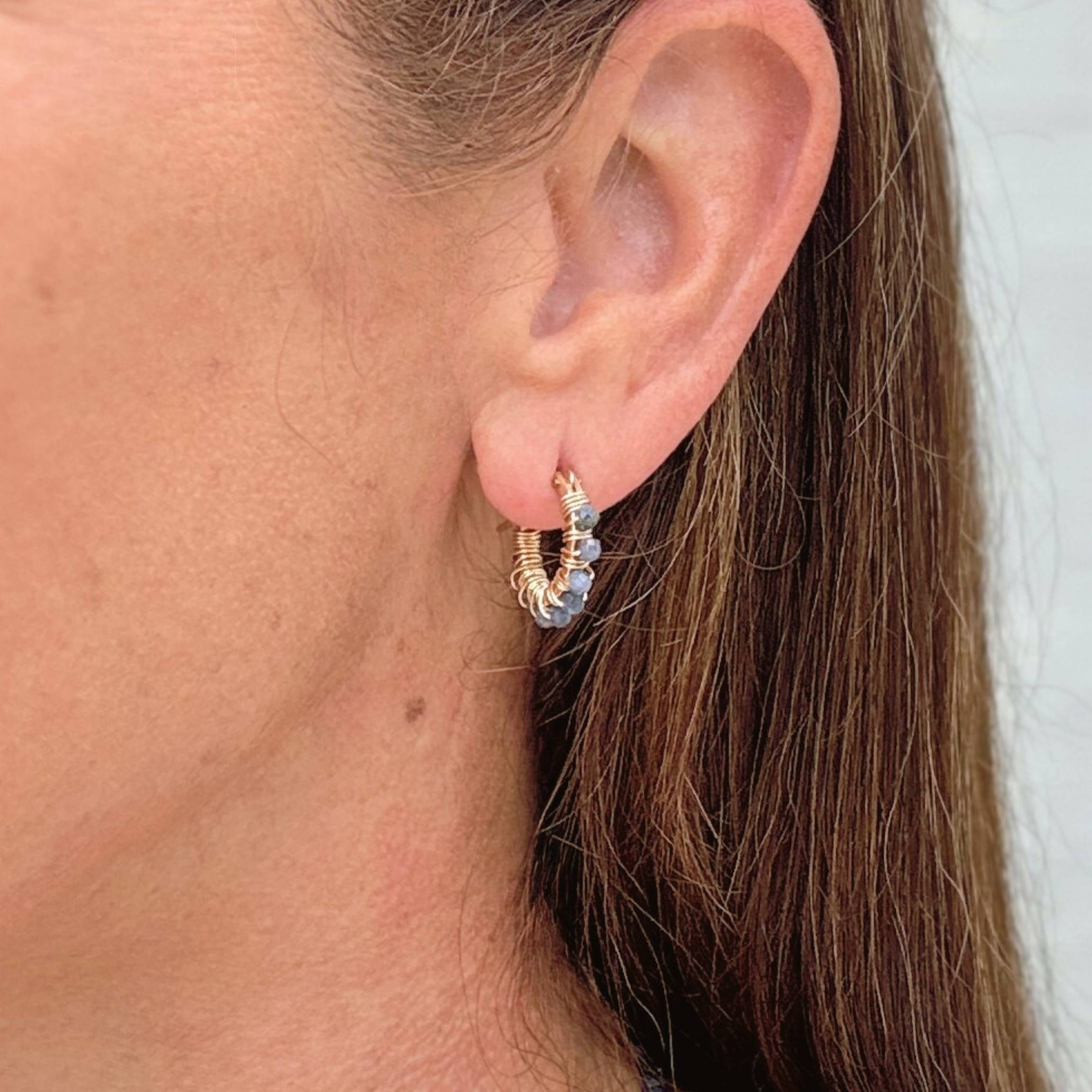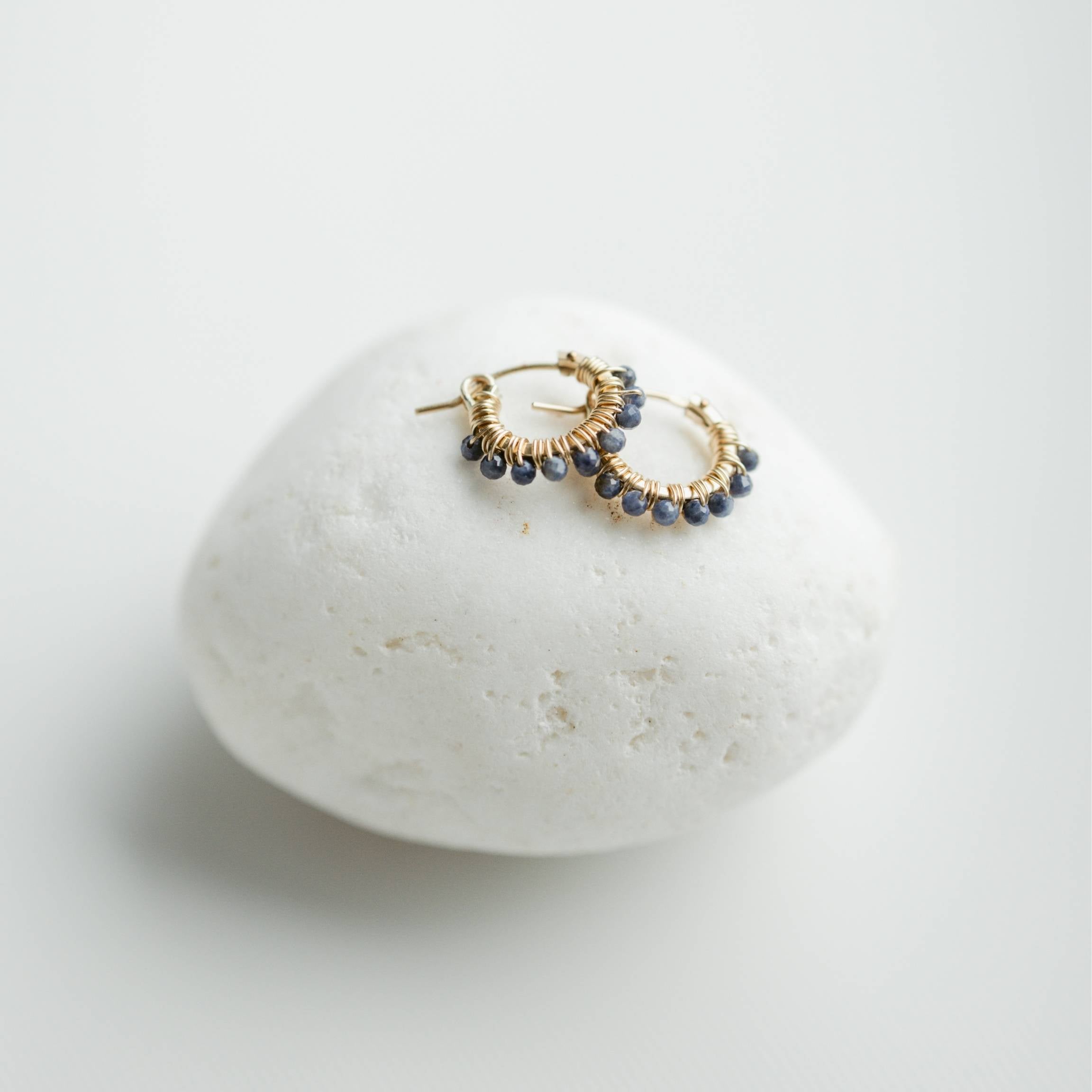 Faceted blue Sapphire rounds are hand-wrapped with gold-filled wire around petite 14k gold-filled huggies. These denim colored gemstone hoops bring just the right touch of casual elegance—like your favorite pair of jeans, they go with everything and can be dressed up or down with ease. They're also a perfect match to our Tallu Sapphire necklace!