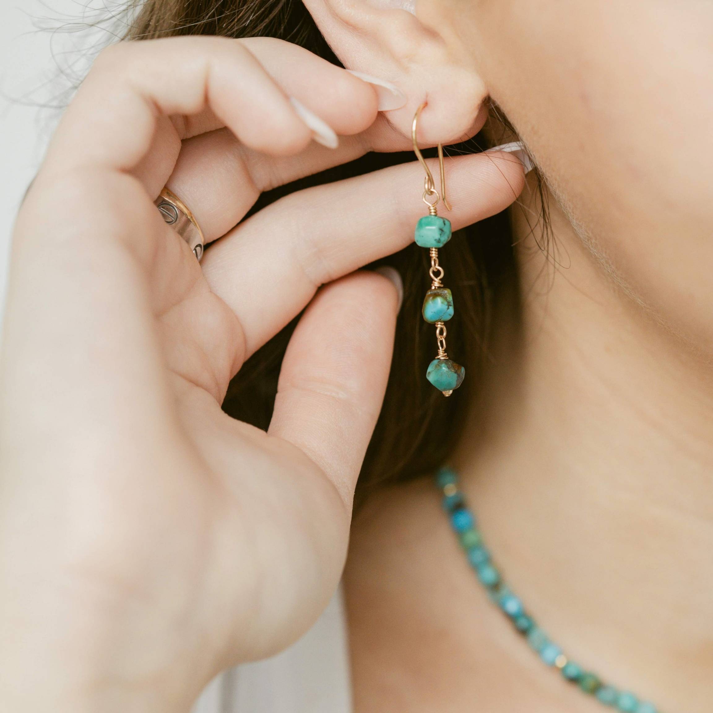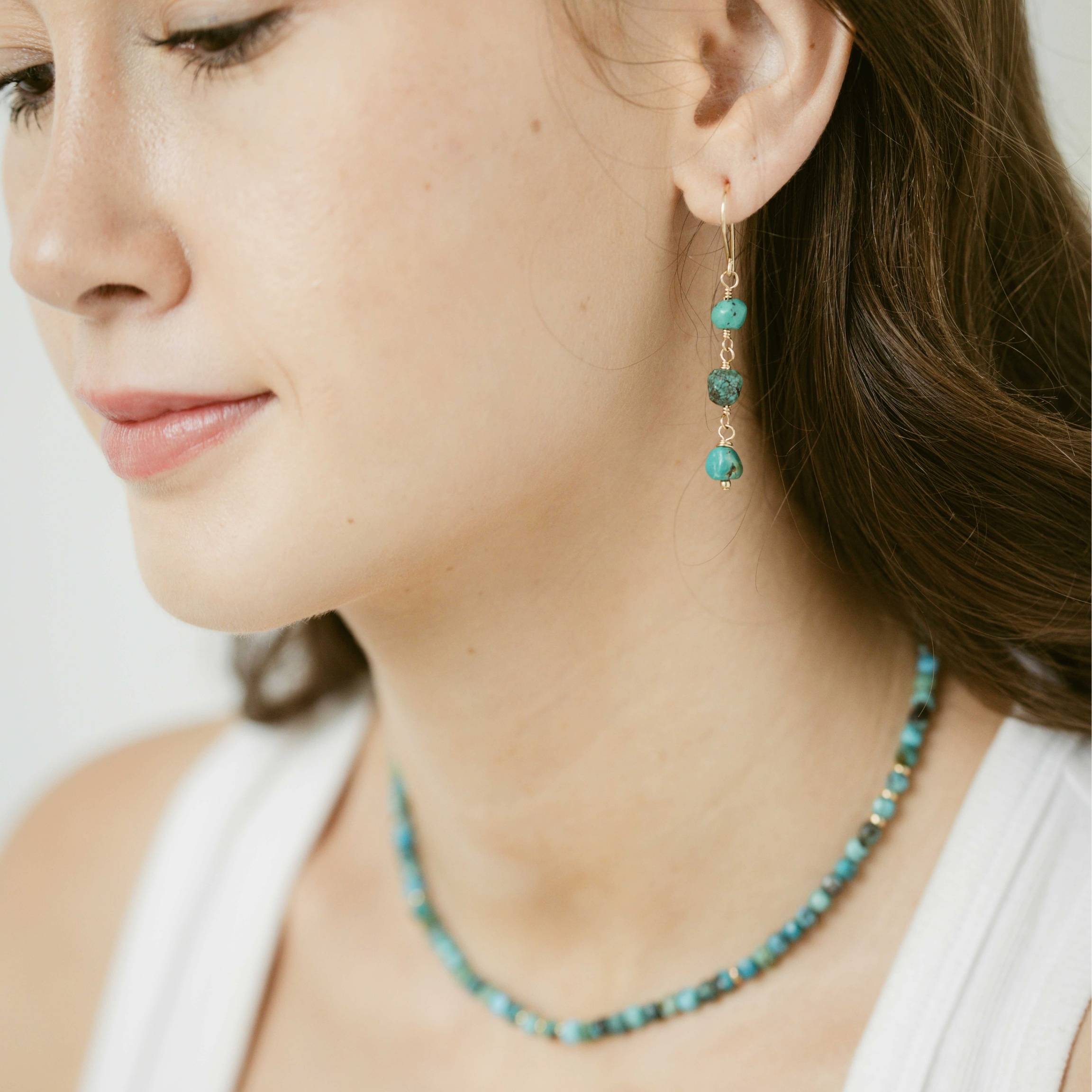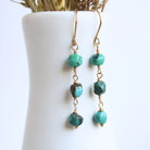 A fresh pop of color with an organic feel. Our Turquoise Dangle Earrings feature three hand-wrapped Turquoise nuggets, each with its own natural shape and vibrant hue. The stones are linked in a delicate line of gold, creating a graceful, light catching drop that adds effortless charm.