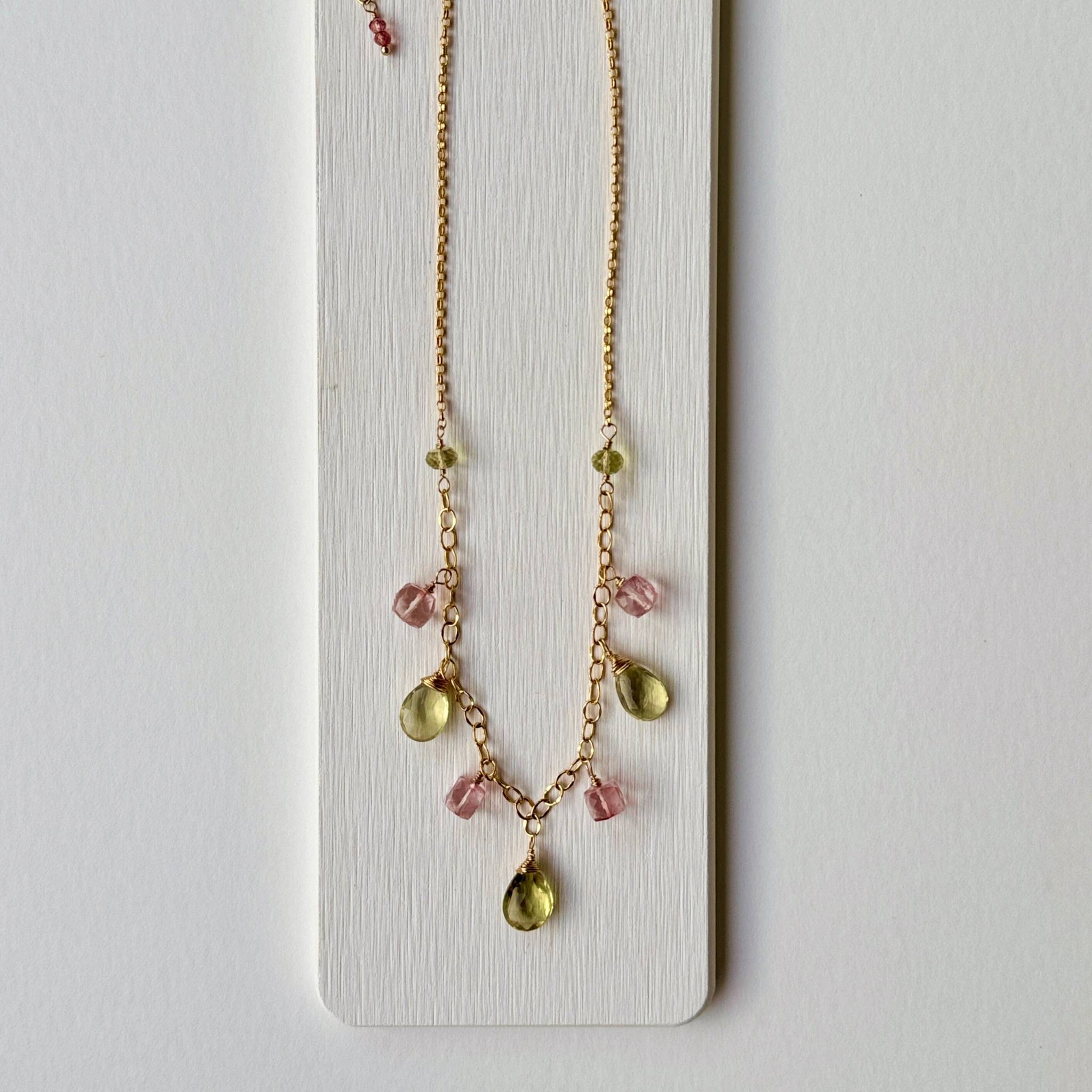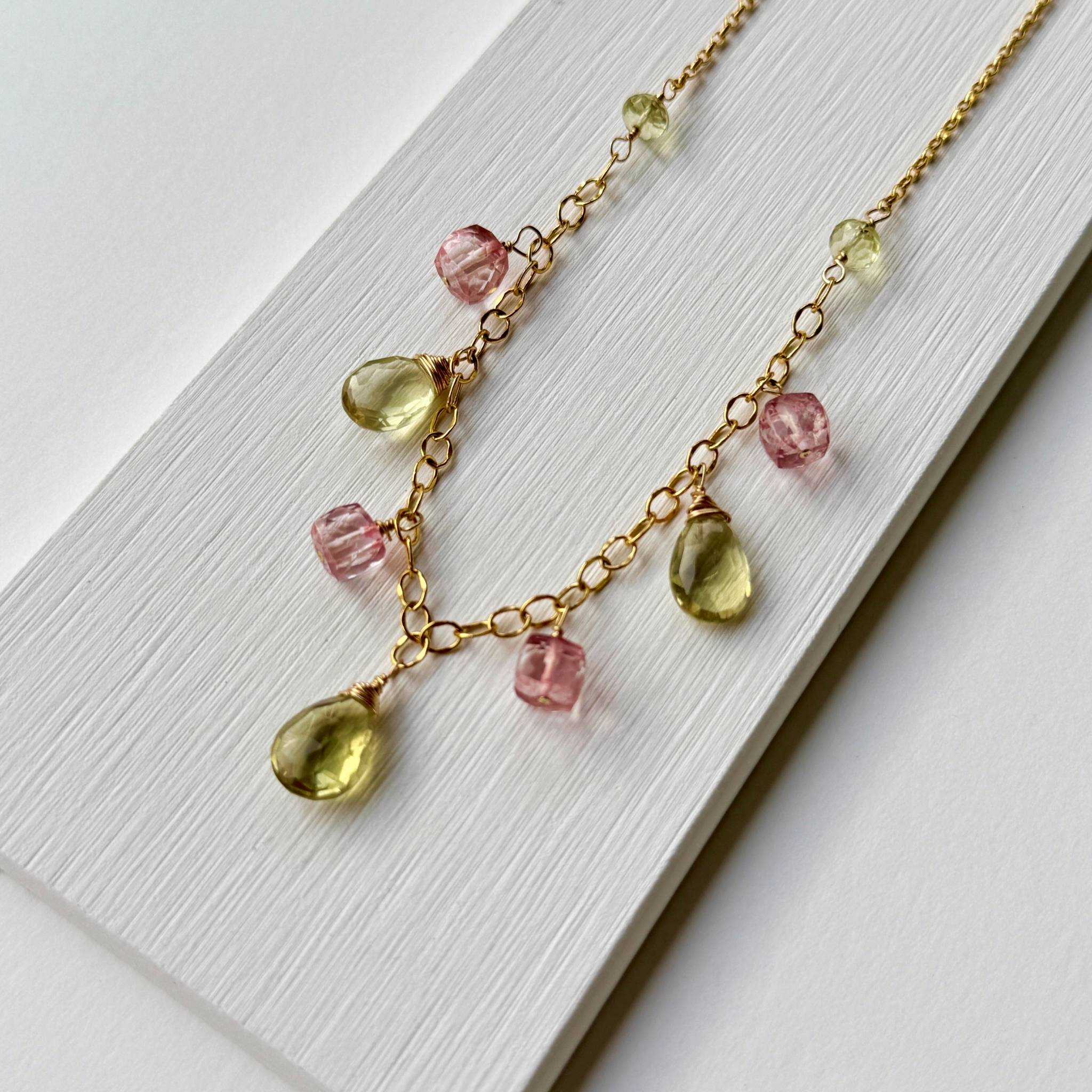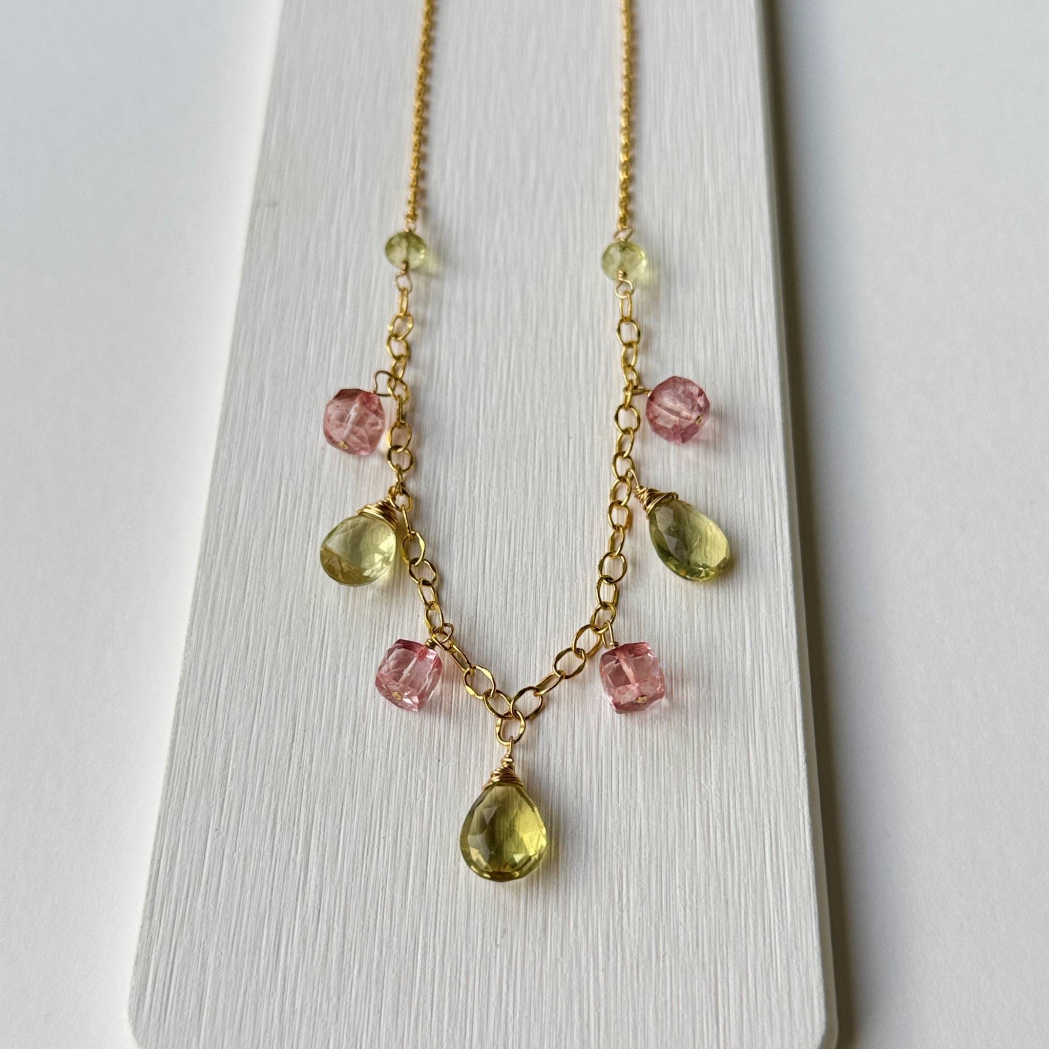 Materials: 14k gold-filled chains & clasp; faceted Lemon Quartz hearts and Pink Quartz cubes