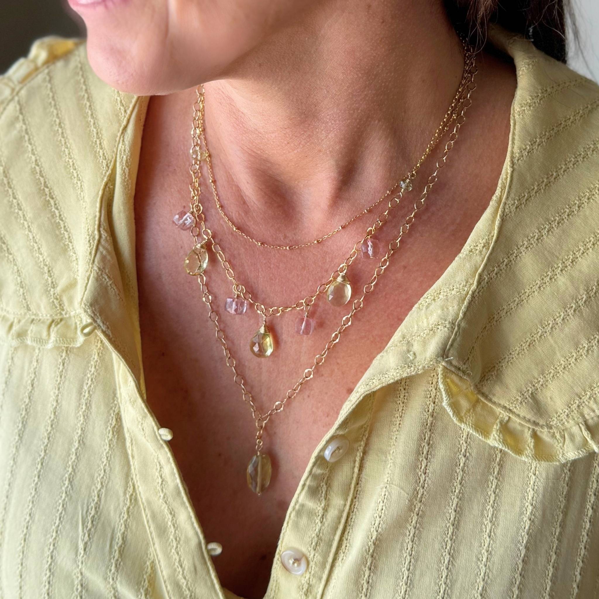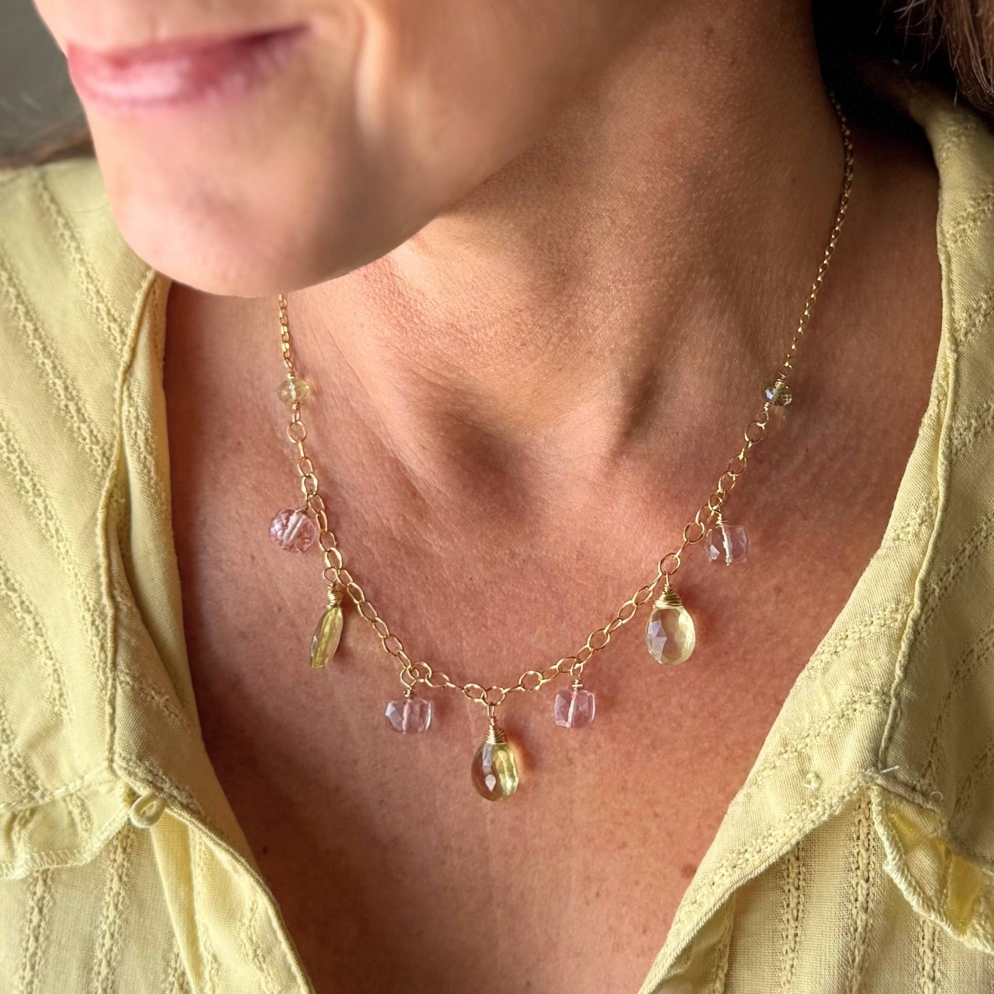 Inspired by the goddess of wisdom, Athena Lemonade embodies both strength and allure. Faceted Lemon Quartz hearts glow with juicy radiance, while pale Pink Quartz cubes add a soft, romantic contrast—the pairing as irresistible and refreshing as a glass of pink lemonade on a summer afternoon. Each gemstone is hand-selected, wire-wrapped, and suspended from a dappled 14k gold-filled chain, with a delicate rolo chain completing the design.