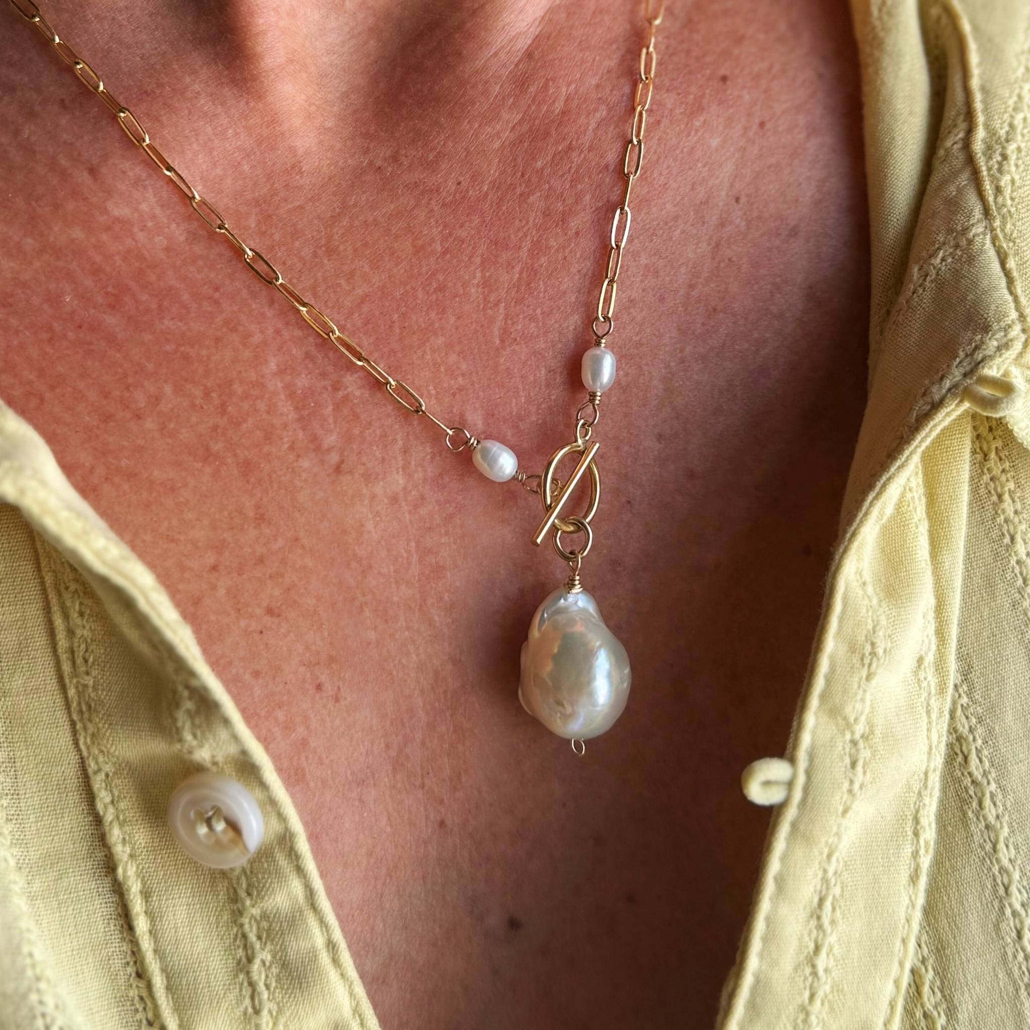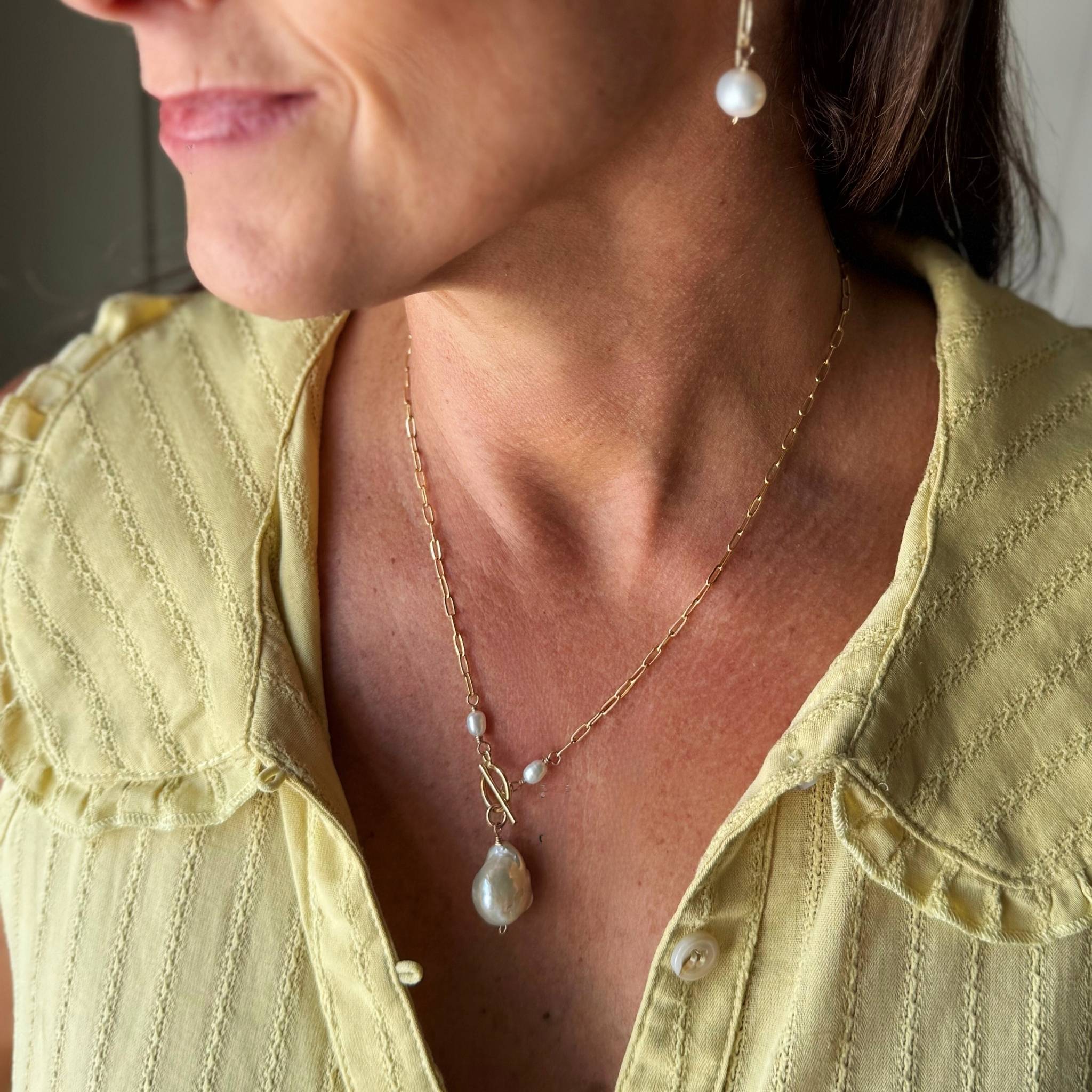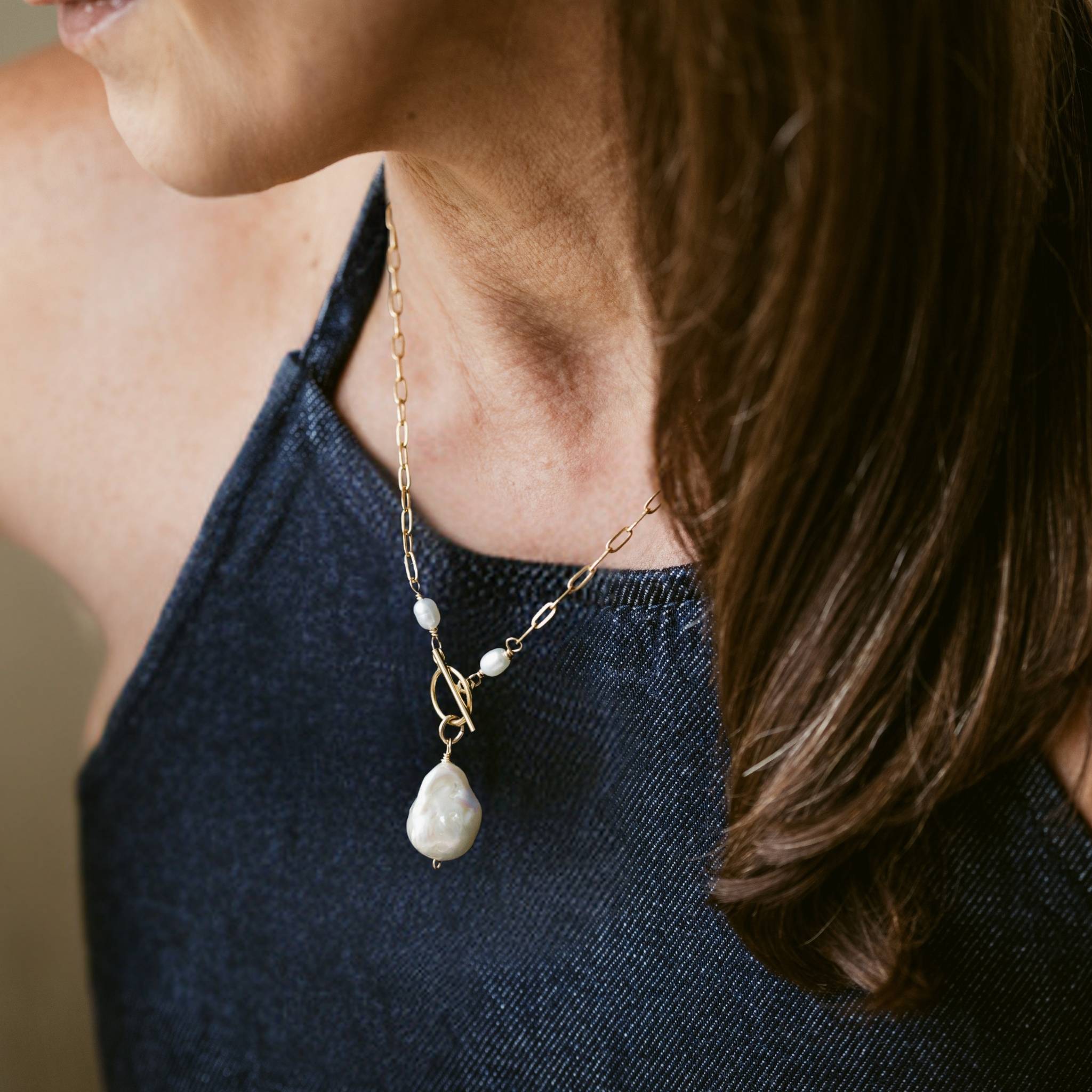 Eloise pairs a medium-weight 14k gold-filled paperclip chain with a delicate freshwater pearls that lead to an impressive focal -- a large, white Baroque Souffle pearl suspended from a gold filled toggle. Its elegant simplicity lets the beauty of the pearl take center stage, creating a look that’s both modern and timeless.