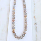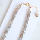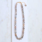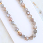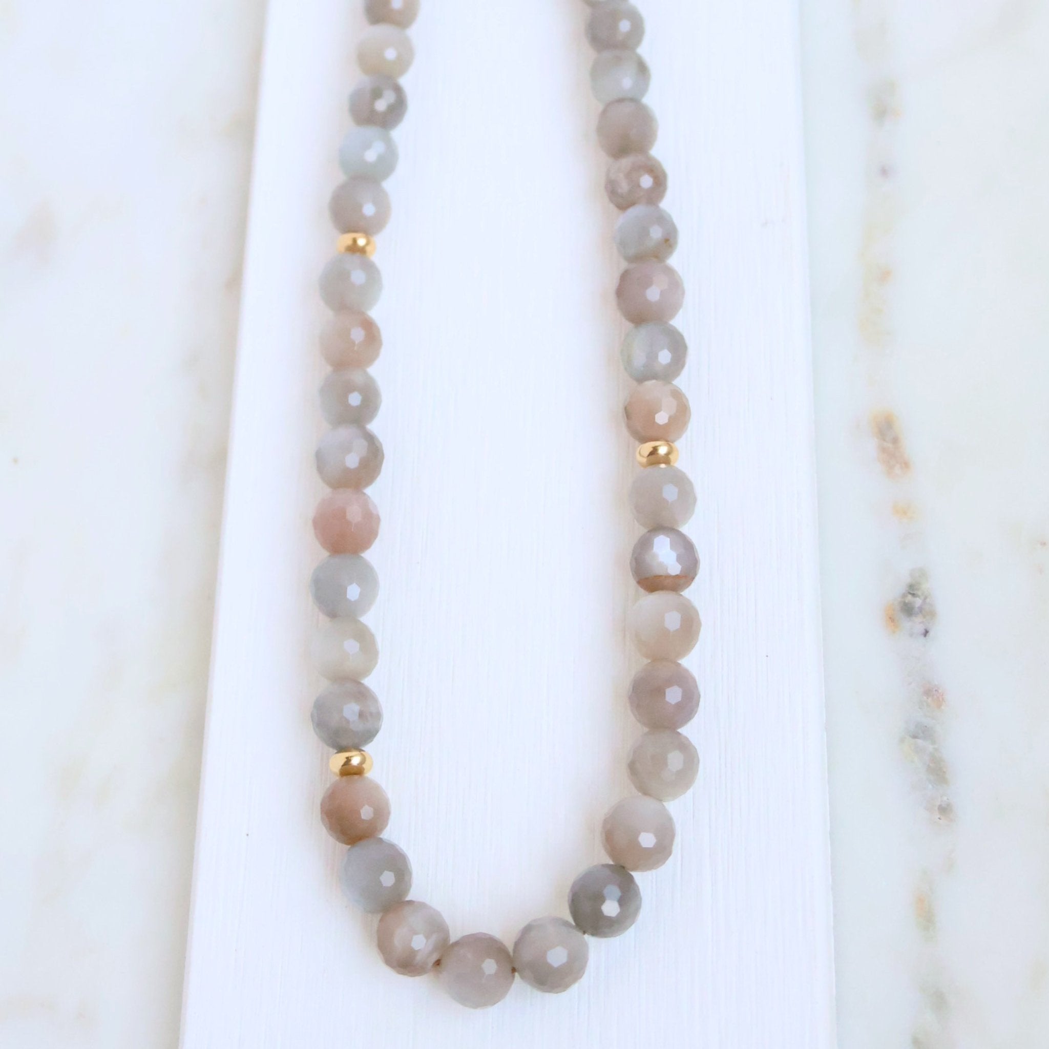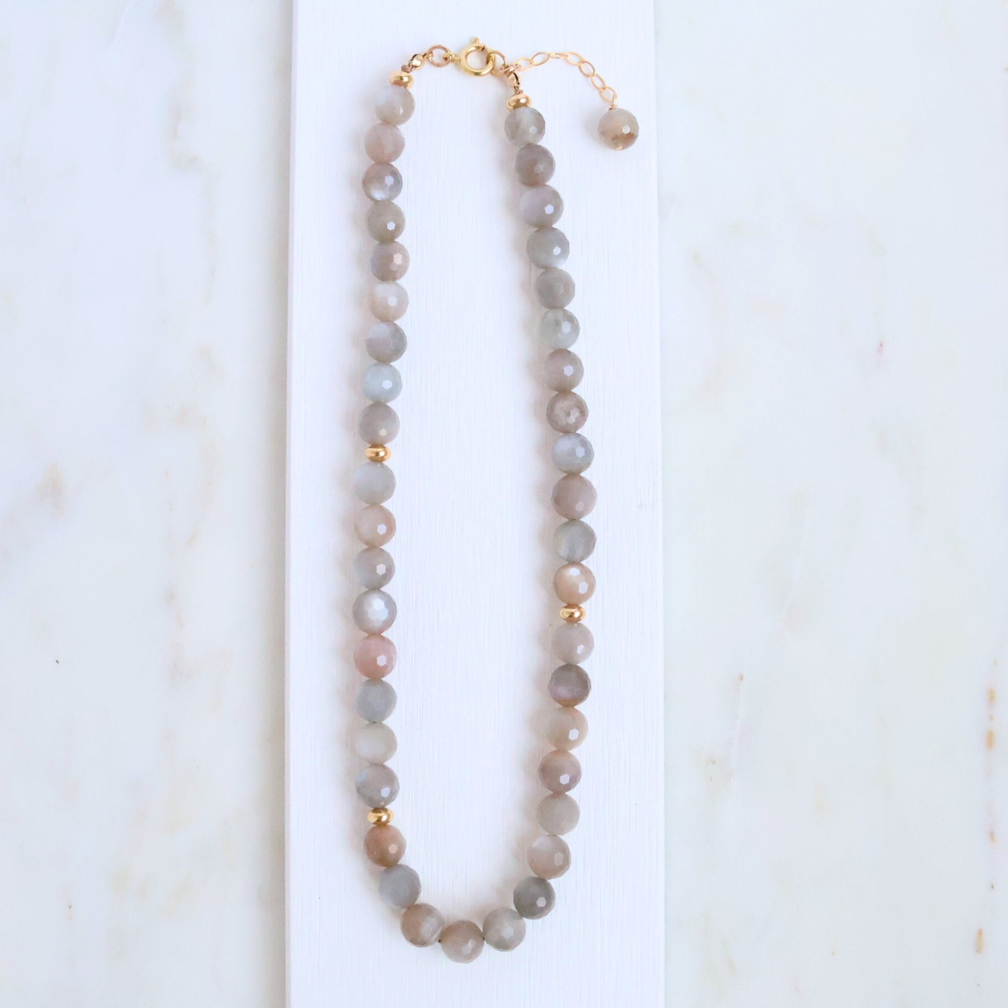 Our Henley Necklace features faceted Moonstone rounds in a dreamy mix of muted grays, peach, and cream, all hand-strung on beige silk cord. The stones catch the light with a subtle iridescence that feels both earthy and ethereal. Like a classic henley shirt, three distinct 14k gold filled beads are placed asymmetrically along the necklace front to give it character.