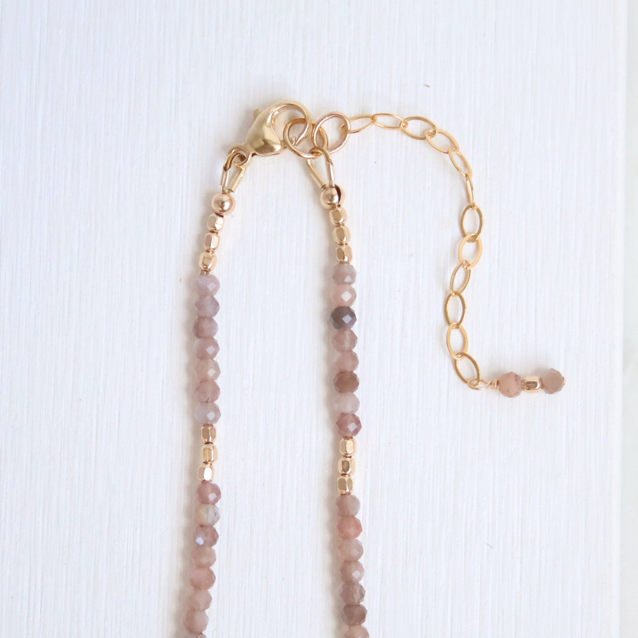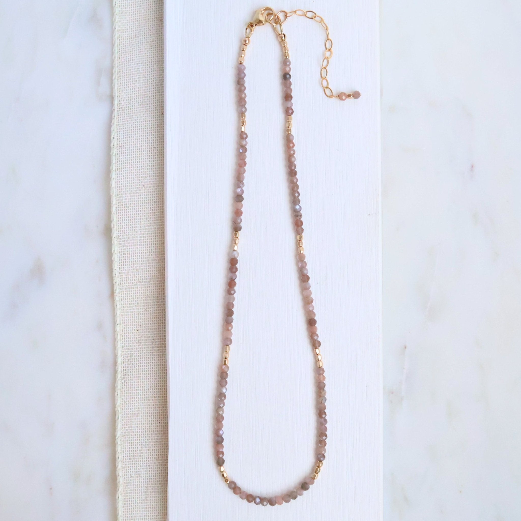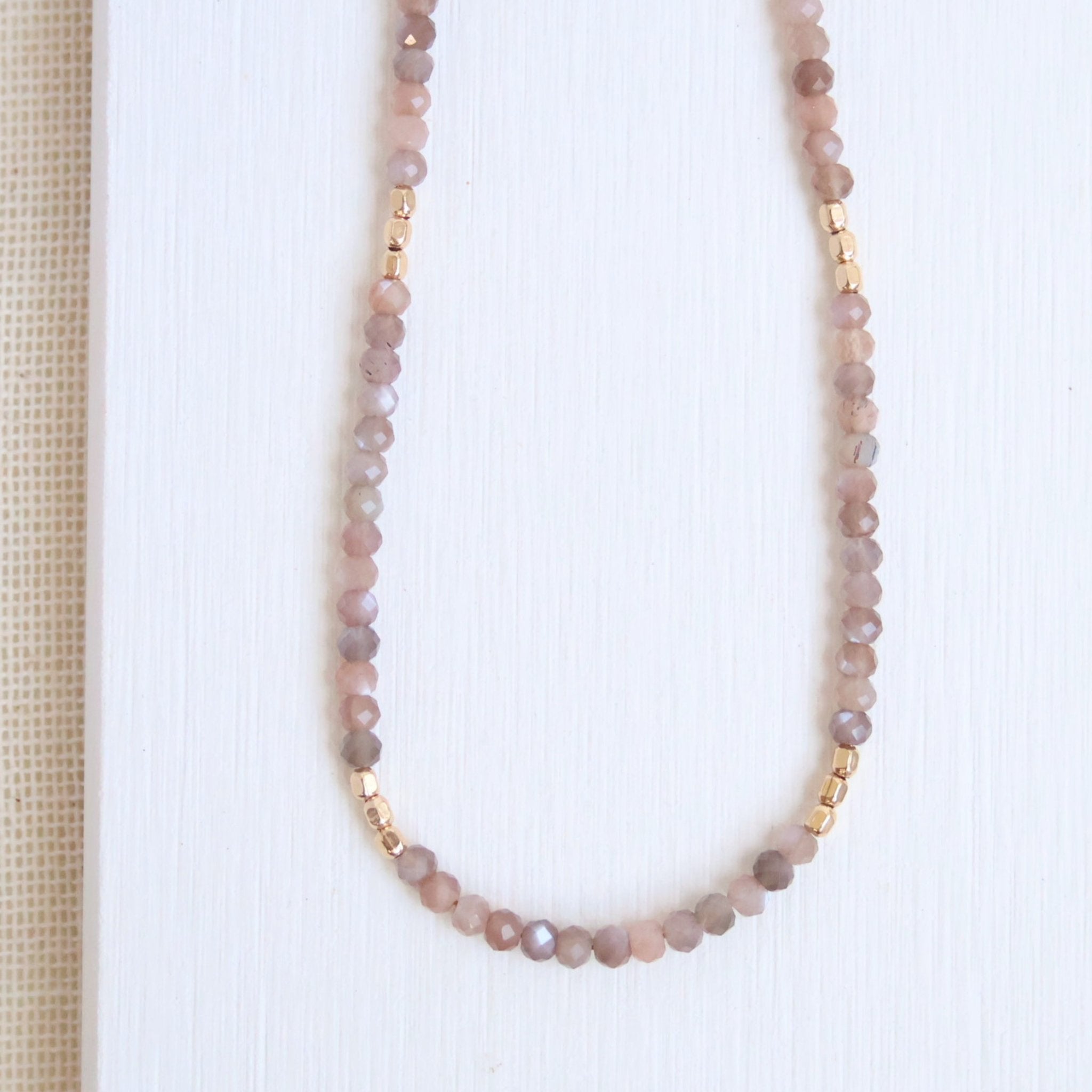 Our Lanie Moonstone is strung with a mink colored Moonstone creating a strand that feels both fresh and luxurious. Tiny gold-filled rectangle beads are threaded throughout, adding shimmer while grounding the iridescent gemstones.