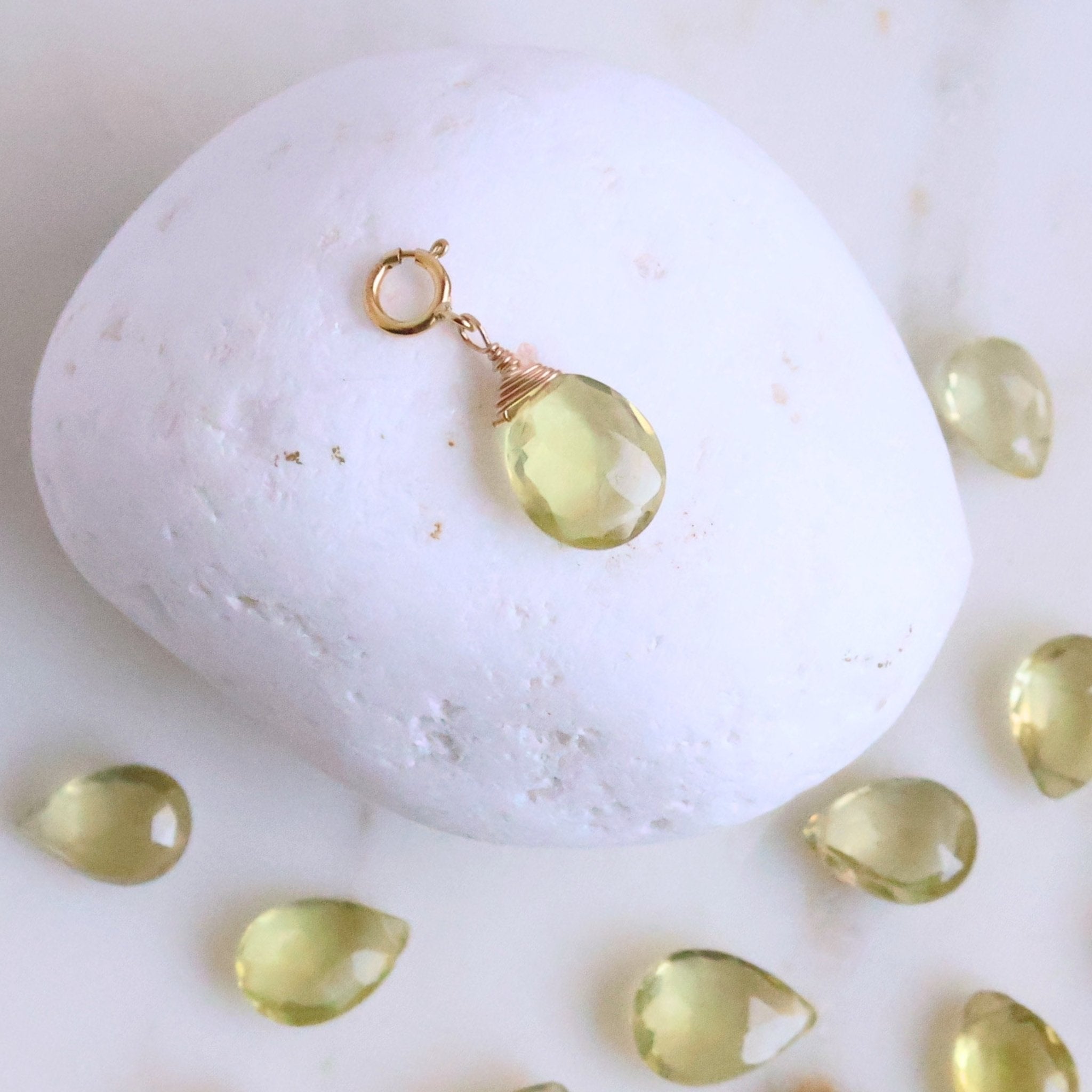 Our stunning Lemon Quartz Heart Charm Drop gemstone brings a colorful pop to any chain that feels playful and up lifting. Designed for endless versatility, our removable charm drops can clip securely onto a chain link, over the chain to float freely, or attach to a heavier clasp as a focal accent.