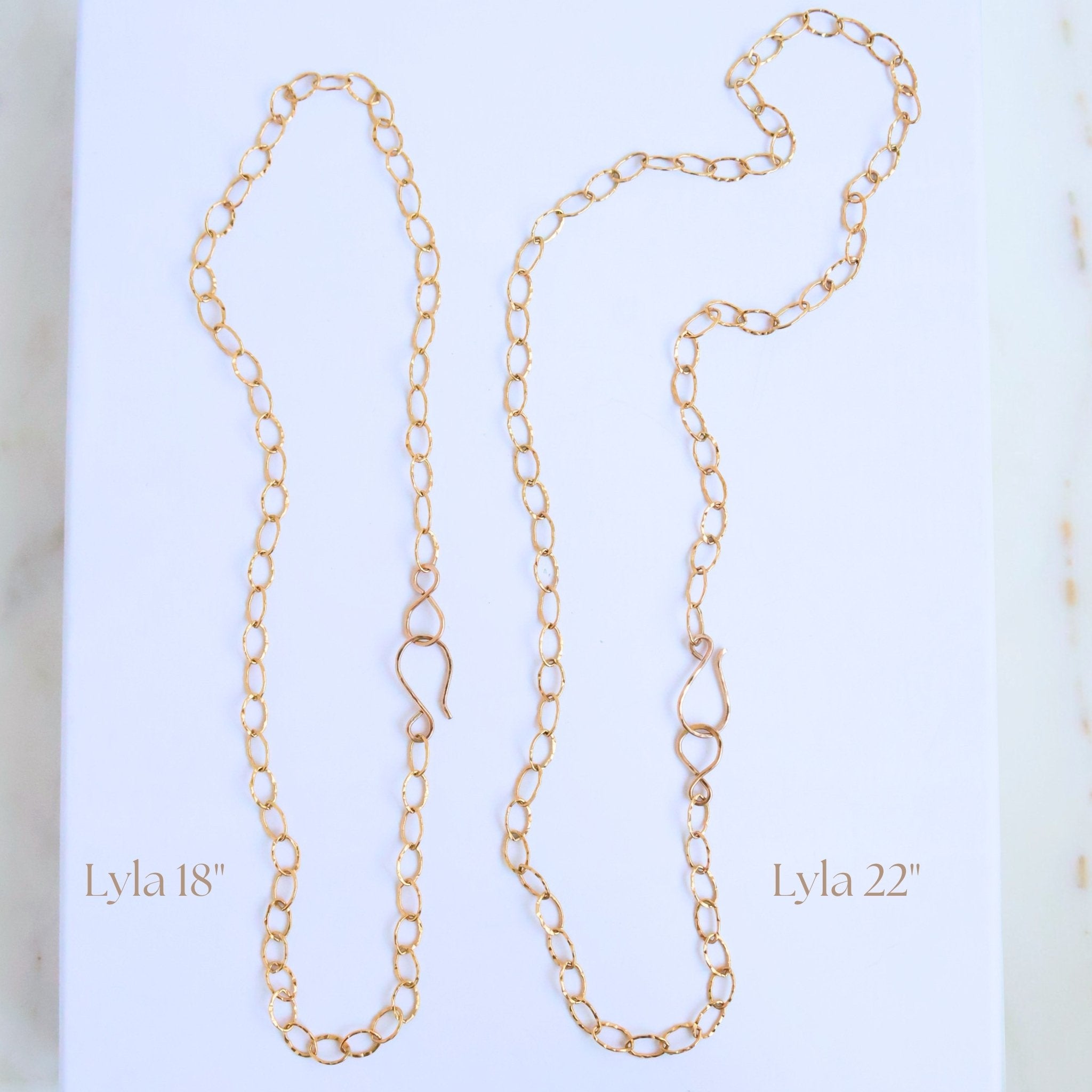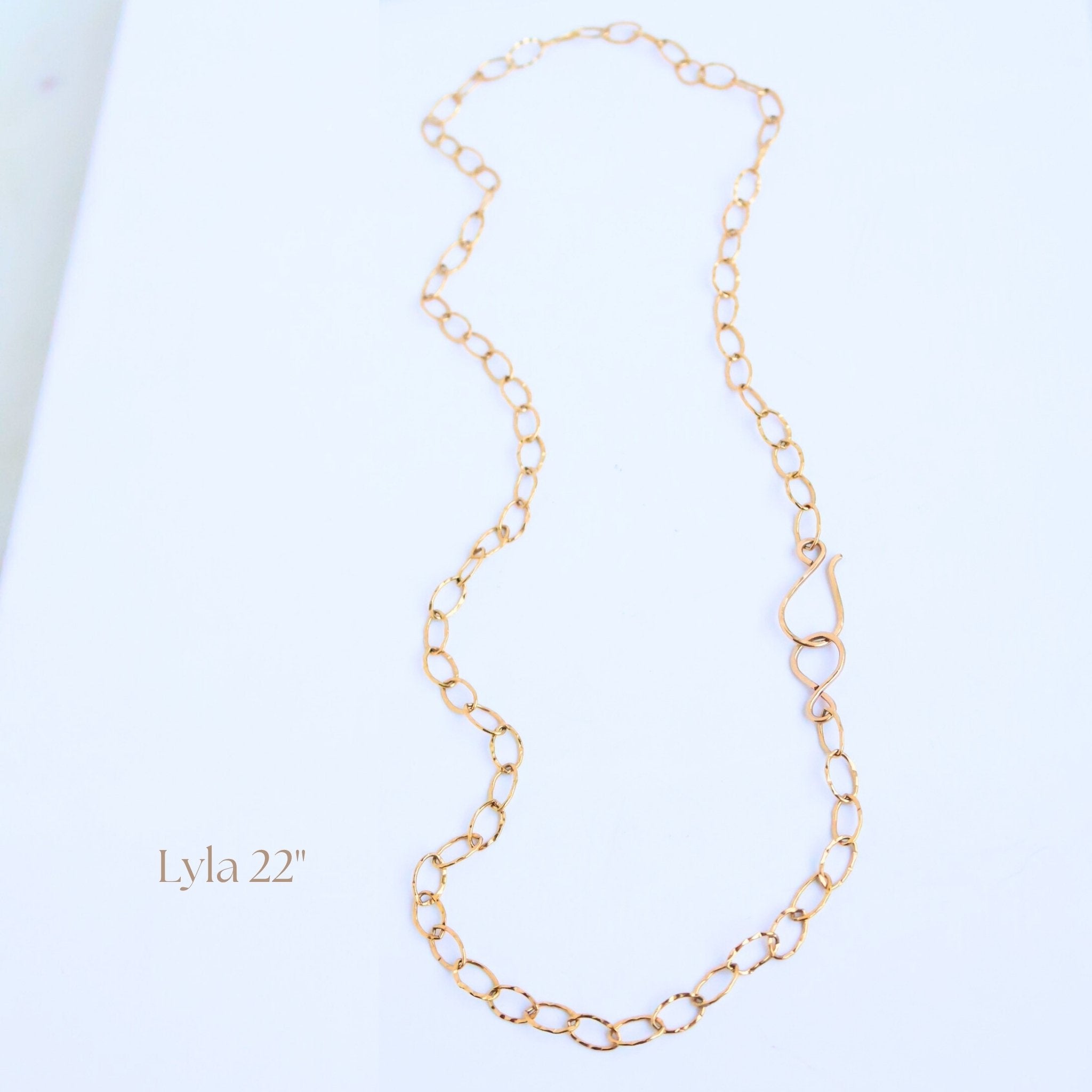 Part of our Everyday Chains Collection, the Lyla 22" is our chunkiest chain. Substantial 14k gold-filled dappled oval links make a bold statement on their own, while also serving as the perfect base layer or anchor for one of our midi or grande Charm Drops.