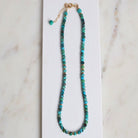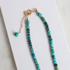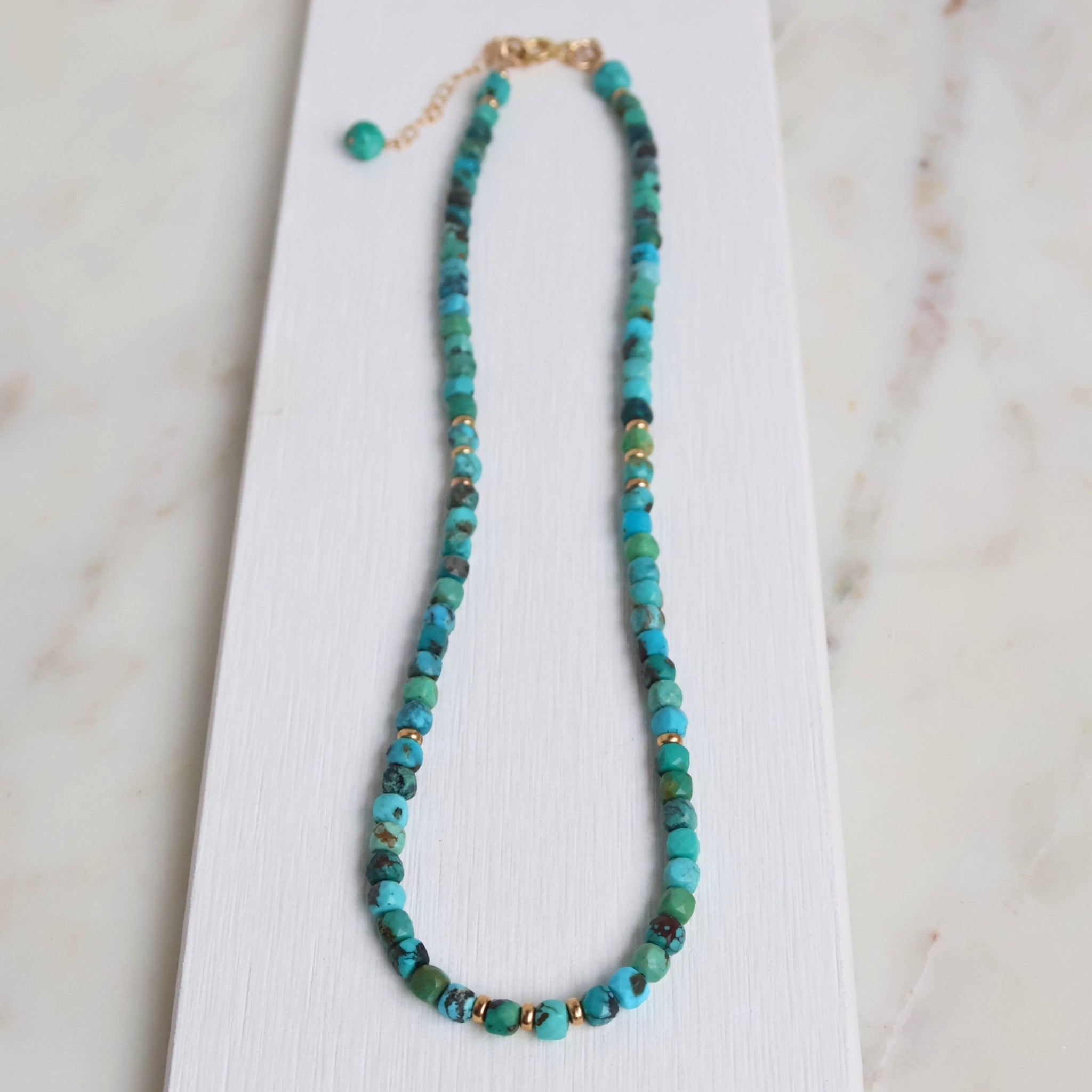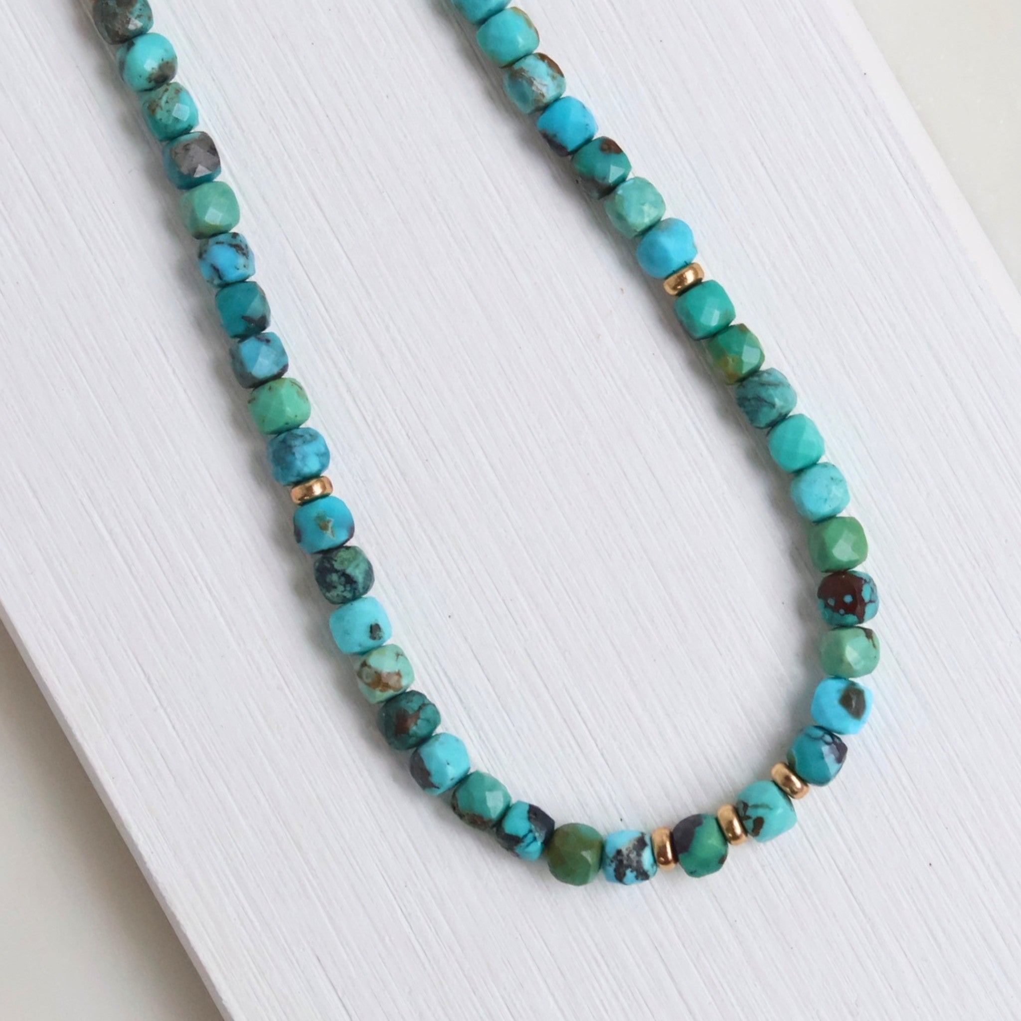 Willa Turquoise showcases faceted cubes of natural Turquoise with vibrant blue-green coloring and brown veining. 14k gold-filled accents are interspersed throughout the necklace, giving it a hint of sparkle and elegance.