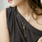 A necklace of many moods, Wisdom is designed for versatility. Wear it three ways: as a classic long strand with the clasp in back, with the toggle in front to showcase the Labradorite charm, or as a sleek lariat by threading the bar through the toggle and letting it rest naturally against the stones.