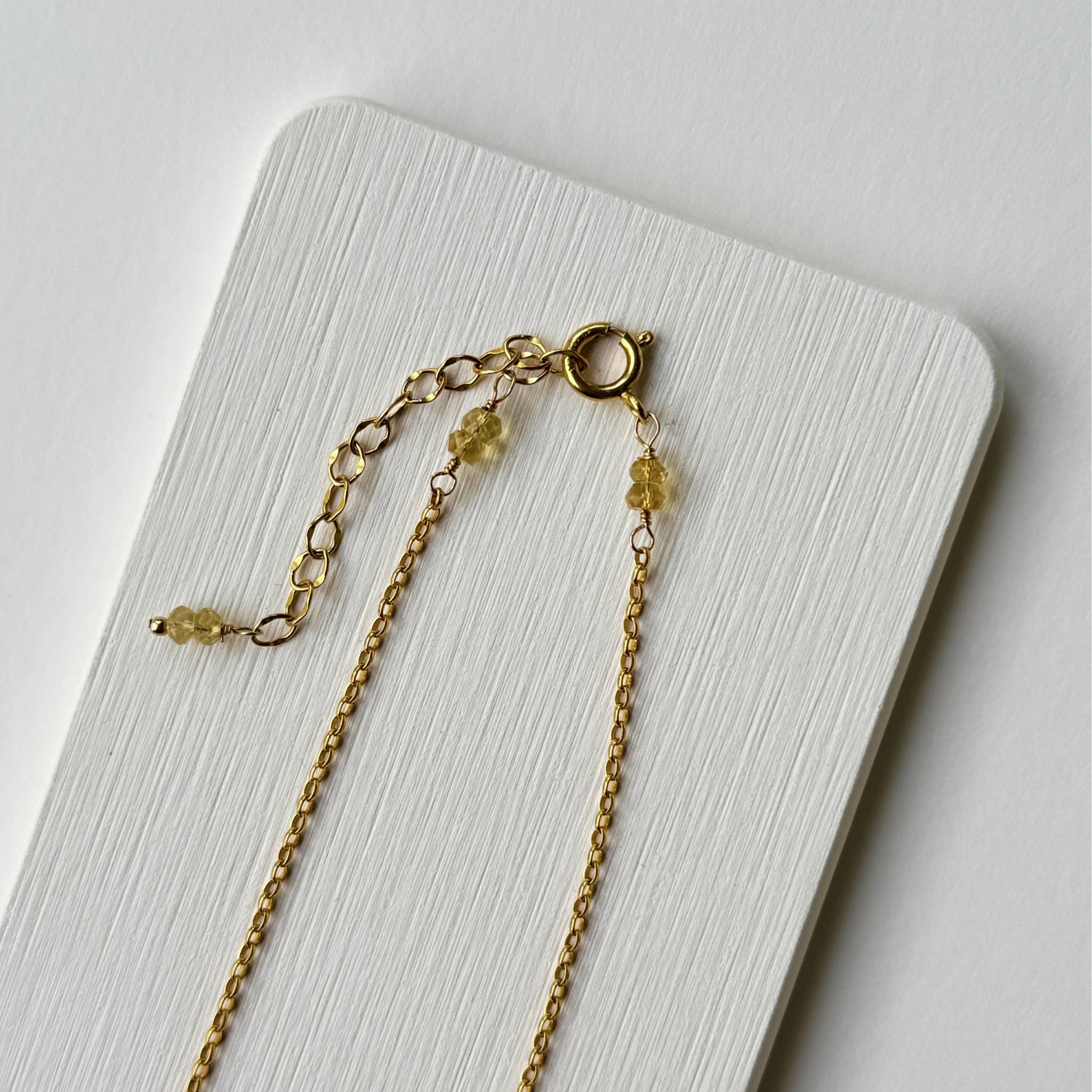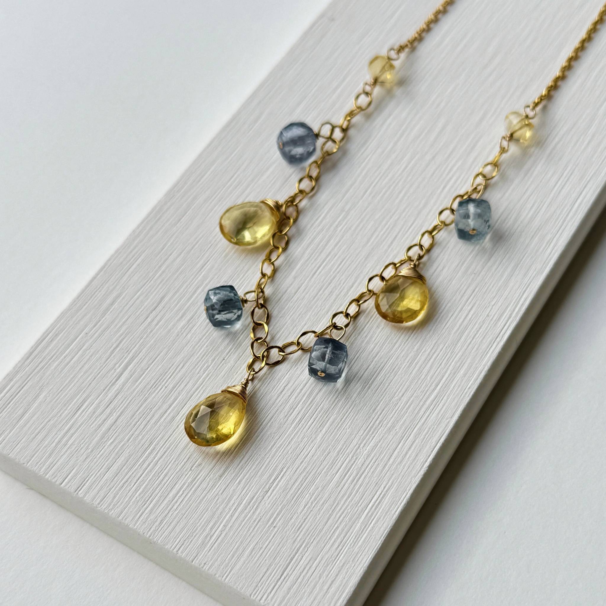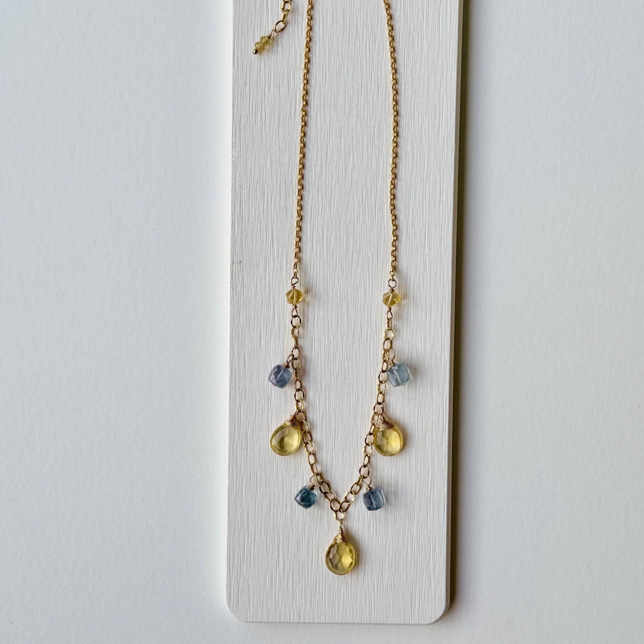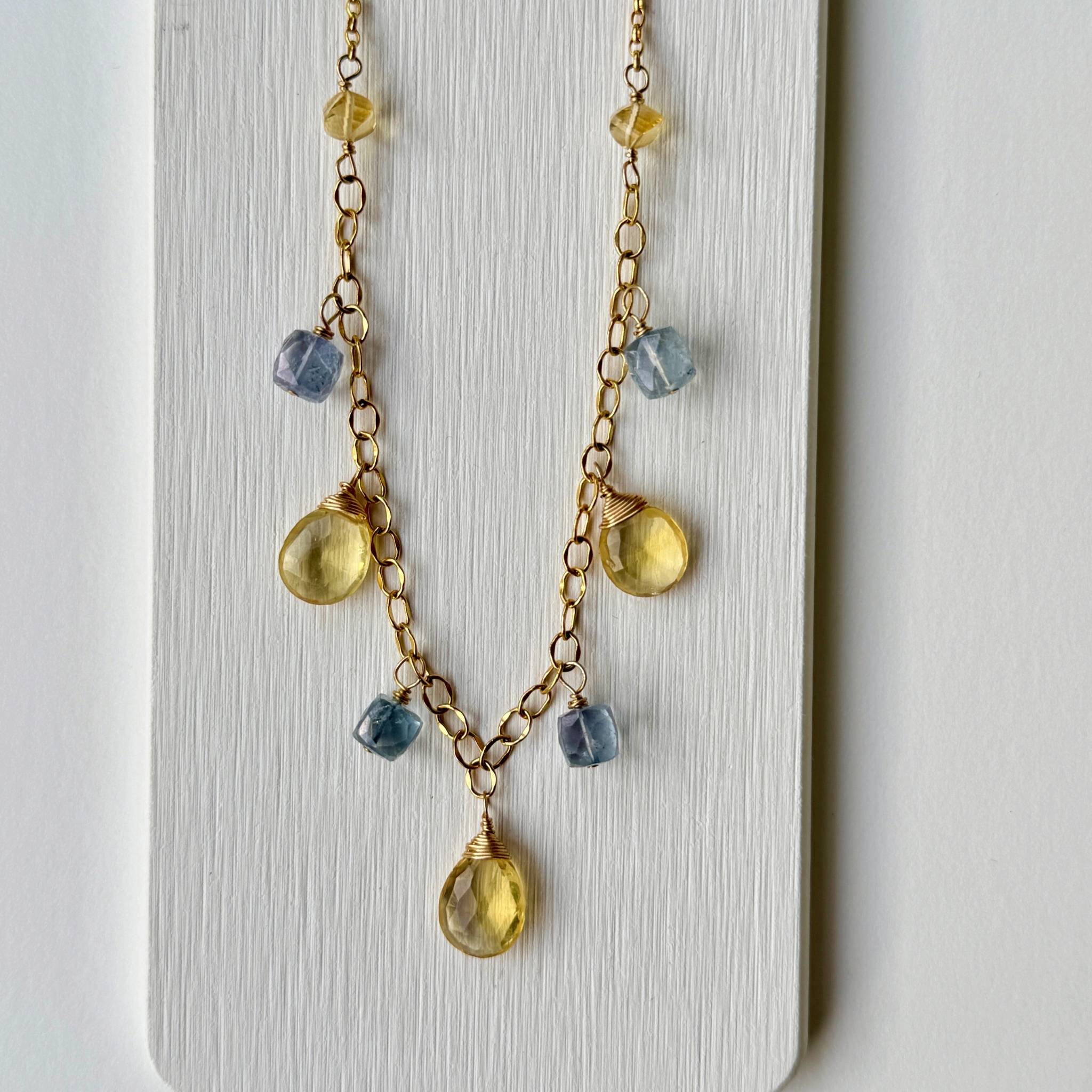 Materials: 14k gold-filled chains & clasp; faceted Citrine hearts and Blue Quartz cubes
