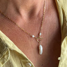 Three ways to shine, one unforgettable necklace. Eloise pairs a medium-weight 14k gold-filled paperclip chain with a delicate freshwater pearls that lead to a luminous focal point: a large, white Biwa stick pearl suspended from a gold filled toggle. Its elegant simplicity lets the beauty of the pearl take center stage, creating a look that’s both modern and timeless.
