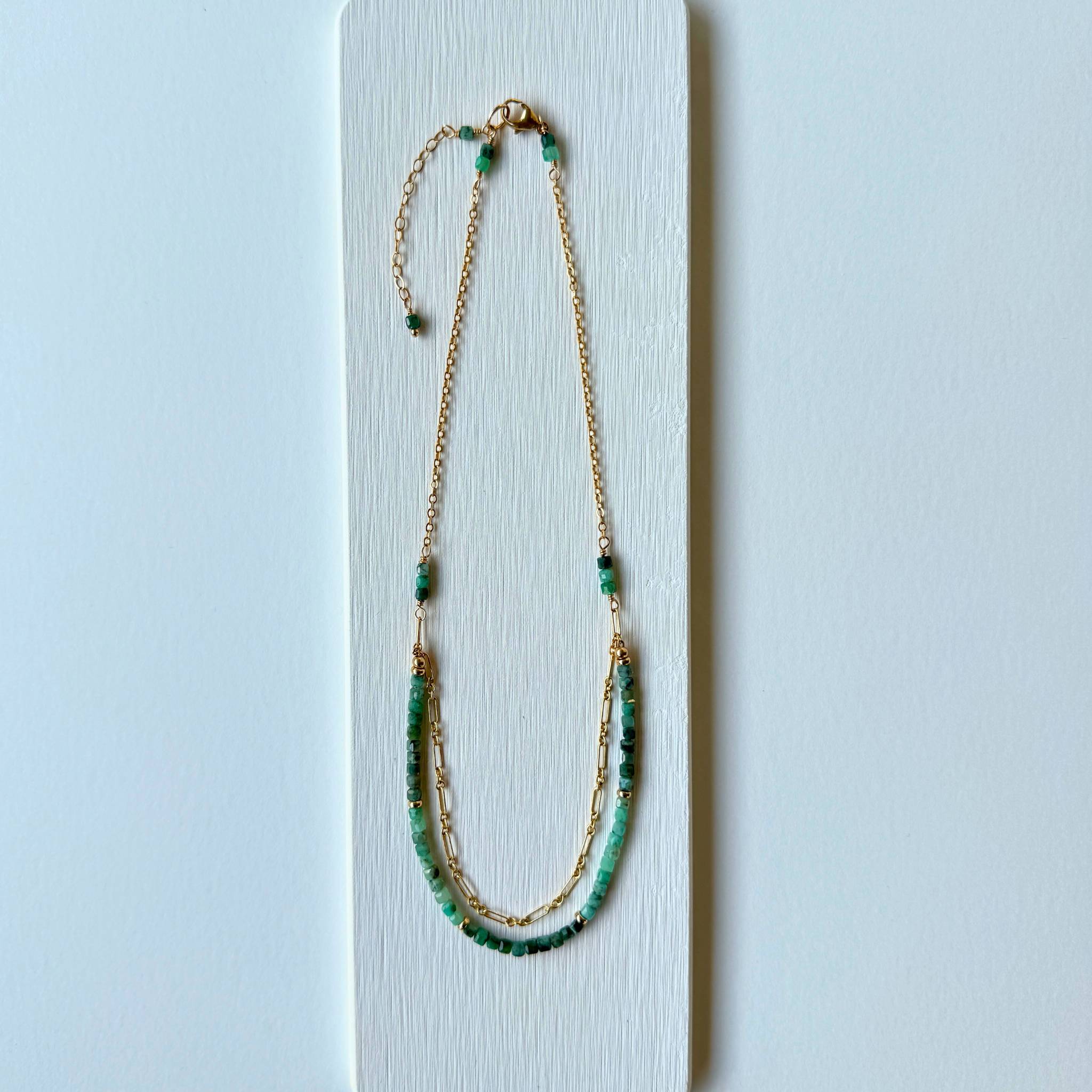 Materials: 14KT gold-filled chains, clasp, and beads; natural Brazilian Emeralds