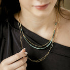 Layered with a short-and-long 14KT gold-filled chain at the front and finished with a delicate rolo chain at the back, this necklace creates a dynamic, eye-catching profile. Wear it solo for a refined statement or layer it for a playful mix of color and texture—the perfect piece to elevate any outfit with just the right touch of natural luxury and pop of color. This same design is available with colorful Fluorite gemstones in our Barcelona necklace as well!