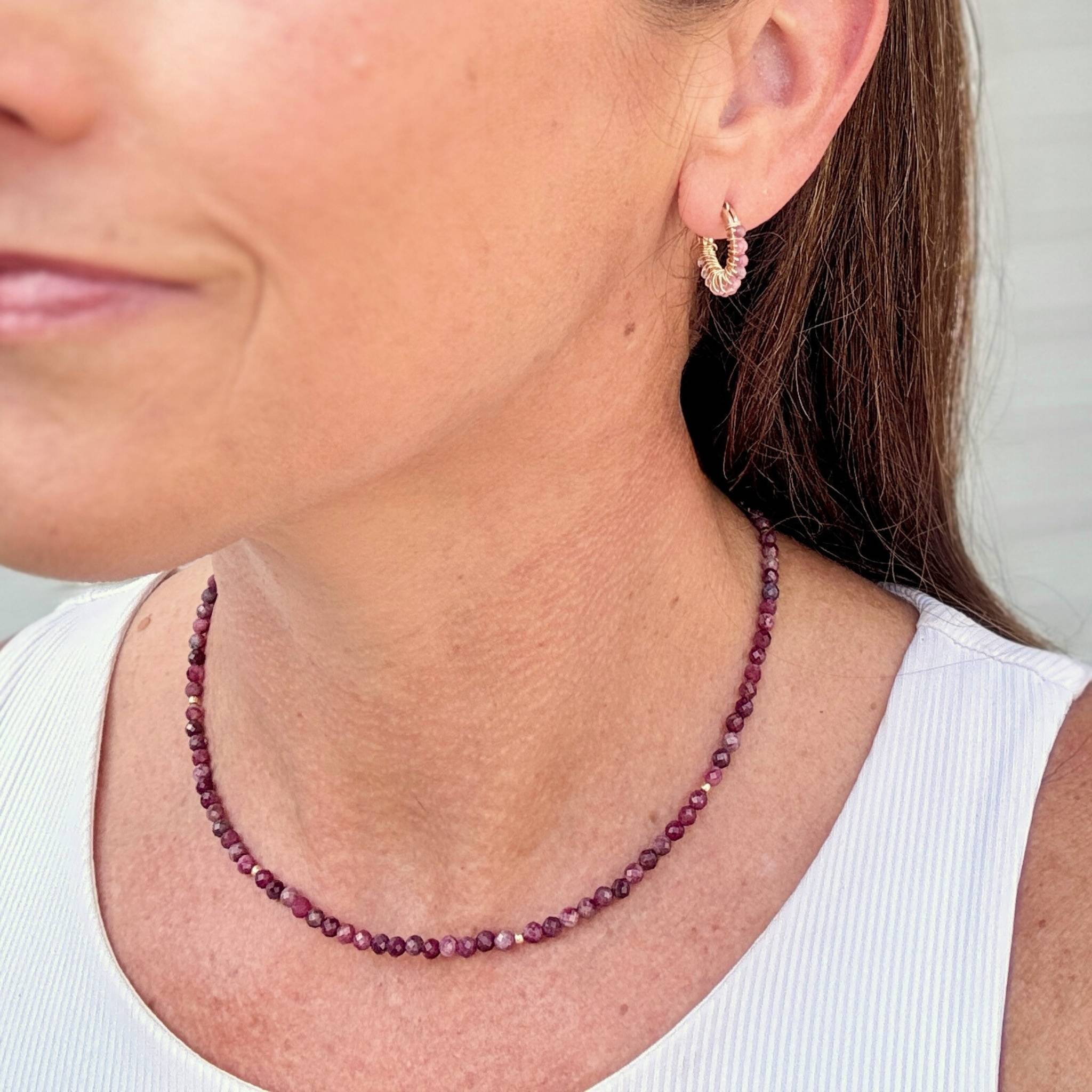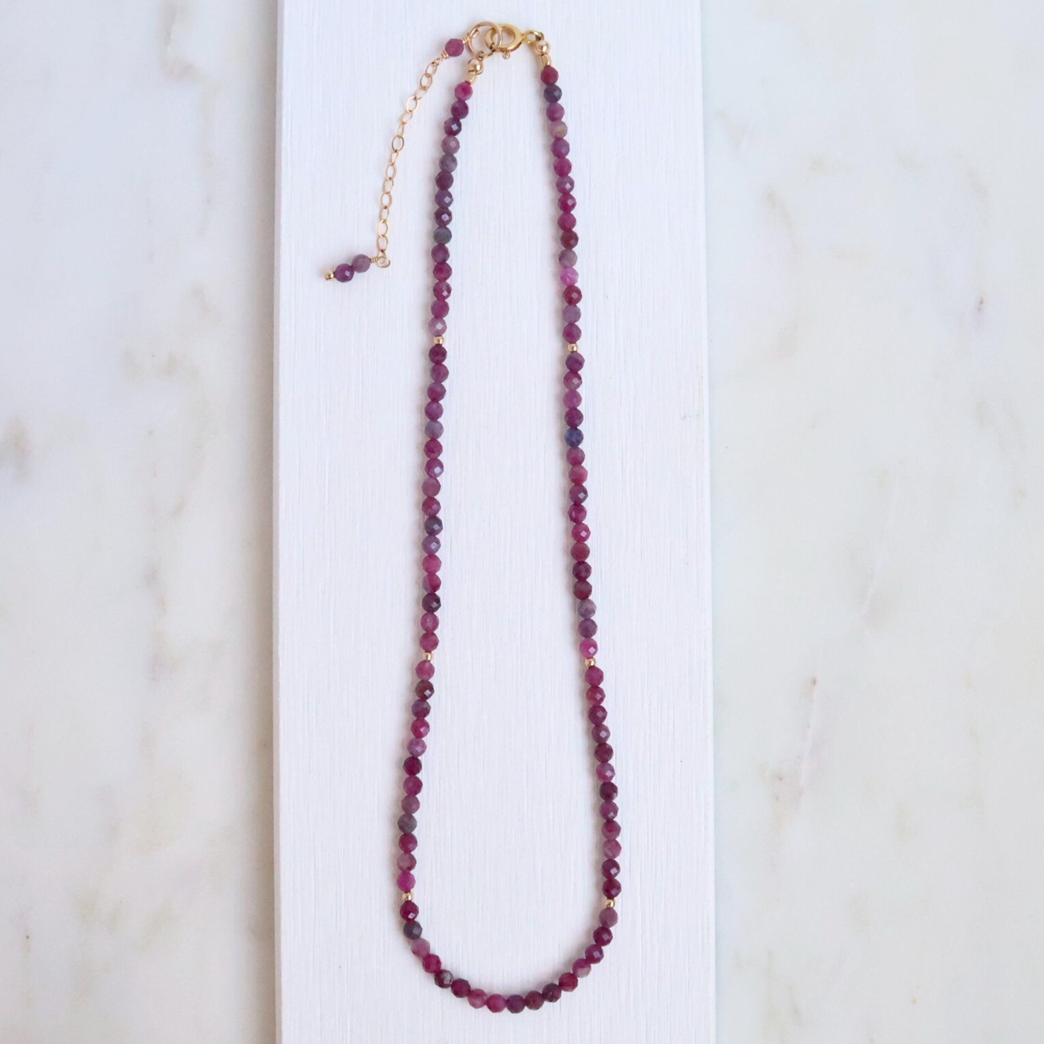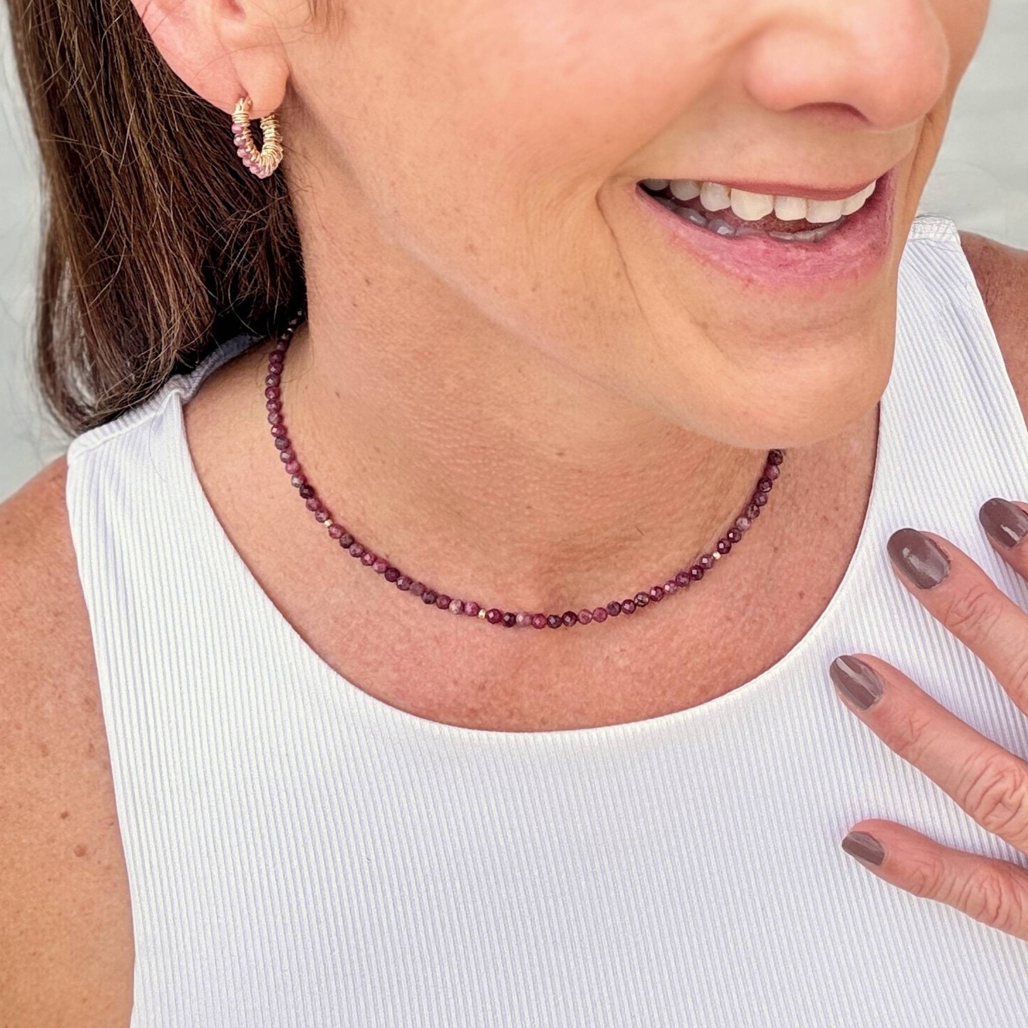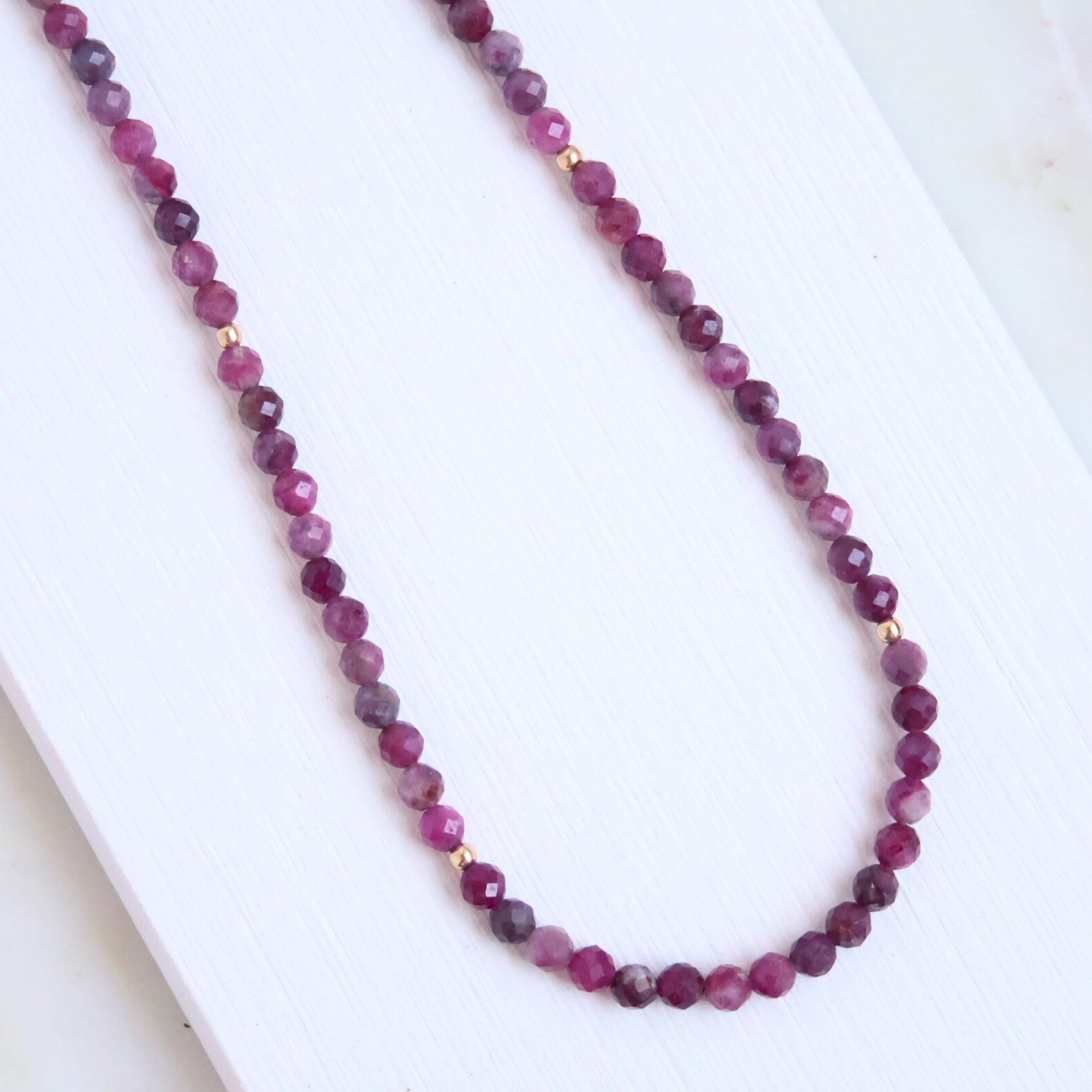 Effortless, timeless, and endlessly wearable. Tallu Tourmaline is strung with faceted pink Tourmaline rounds—with shades ranging from a rich rose pink to dark juicy raspberry—subtly accented with 14k gold-filled beads for a touch of shimmer. This piece gives you a rich, jewel-toned punch of color to accent your wardrobe this season.