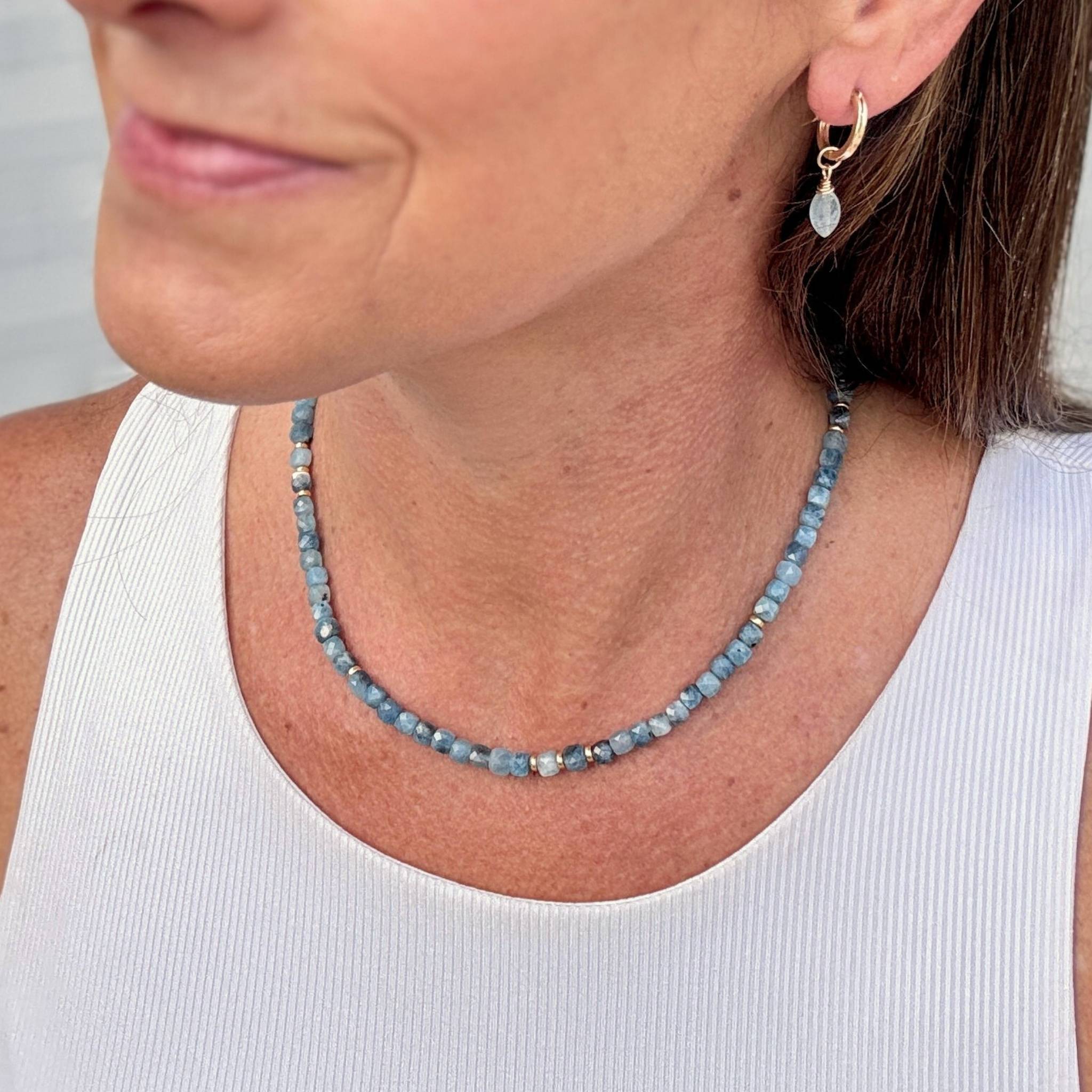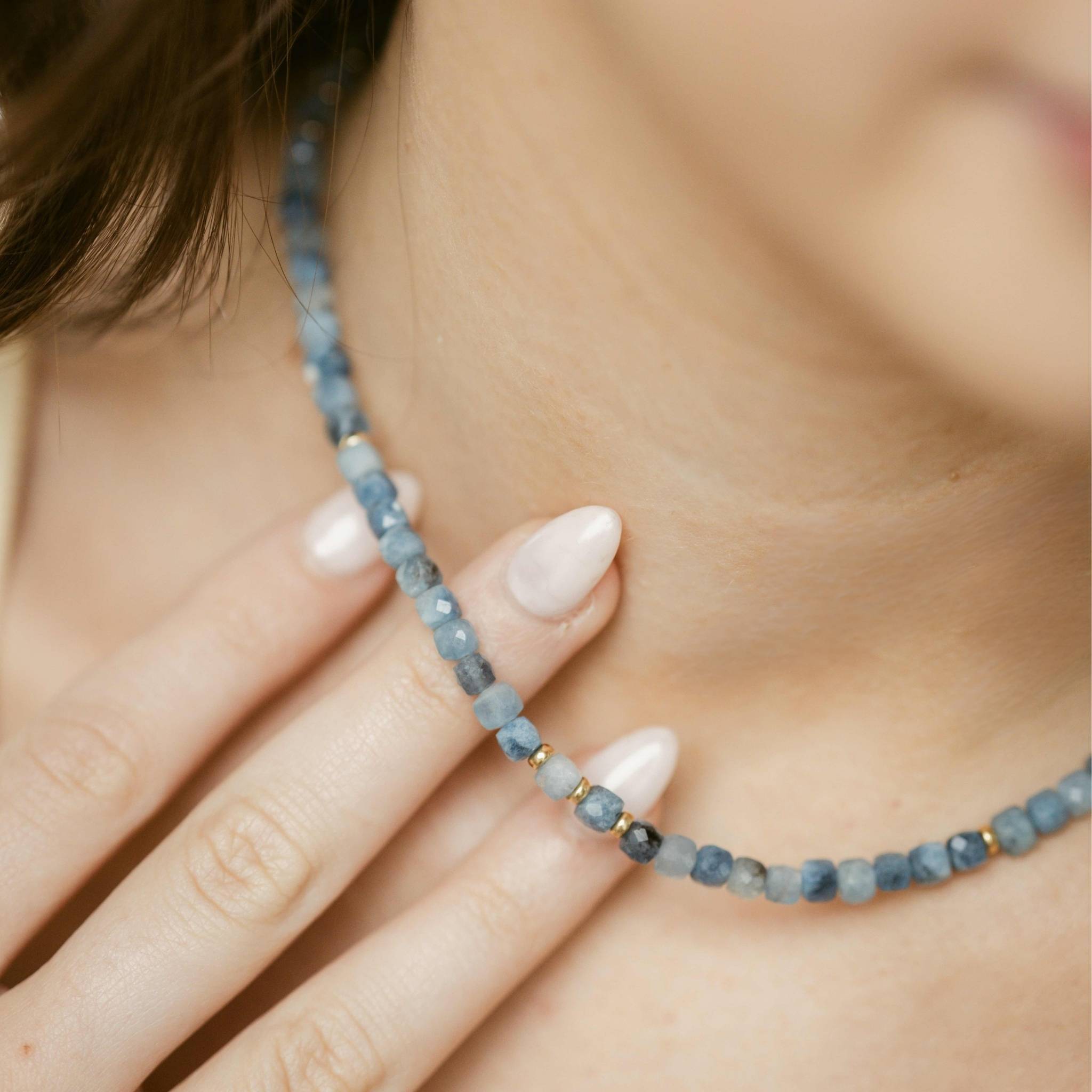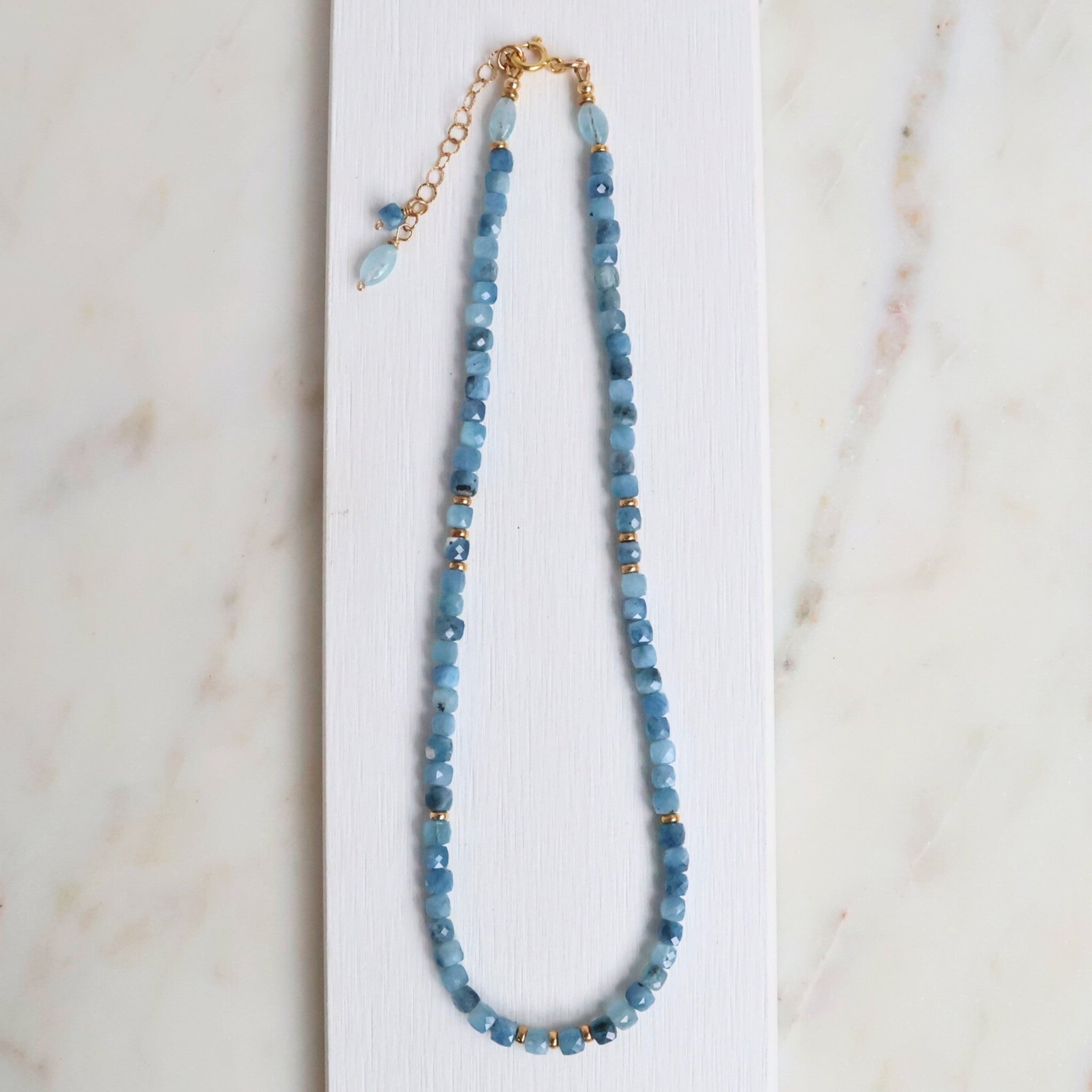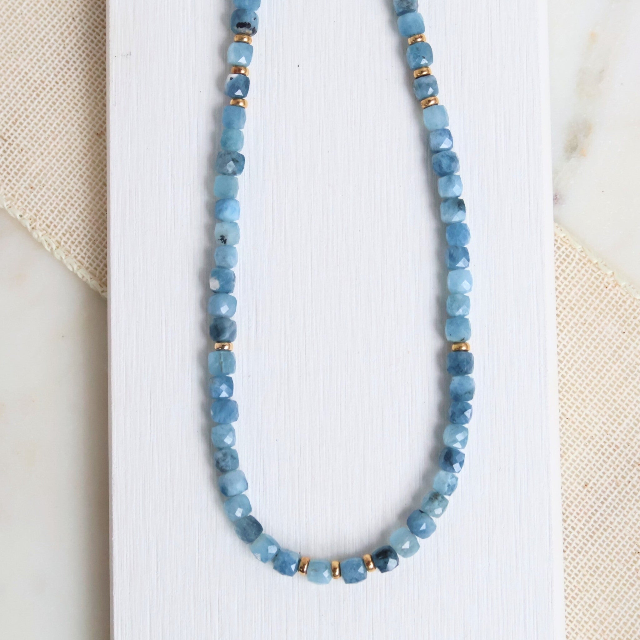 Cool, serene, and effortlessly wearable. Willa Aquamarine showcases faceted cubes of Santa Maria Aquamarine—stones prized for their oceanic hues that shift from the palest blue to deep, mesmerizing azure. Spaced with 14k gold-filled accents, each stone sparkles like sunlight on water.